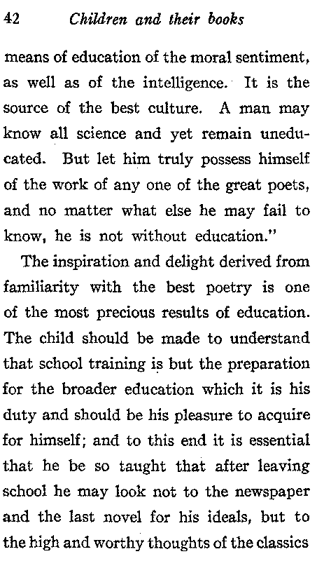 "Poetry is one of the most efficient[42] means of education of the moral sentiment, as well as of the intelligence. It is the source of the best culture. A man may know all science and yet remain uneducated. But let him truly possess himself of the work of any one of the great poets, and no matter what else he may fail to know, he is not without education."