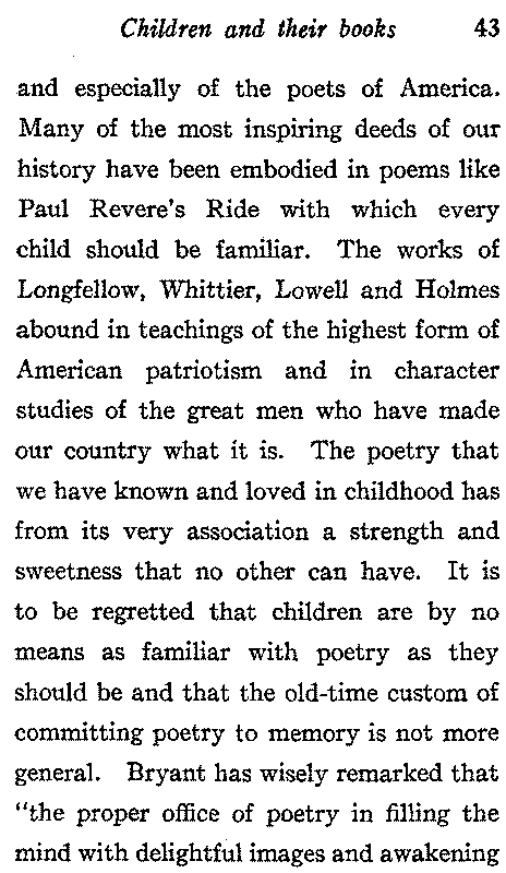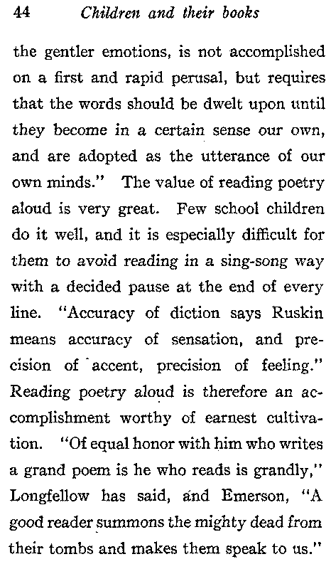 The inspiration and delight derived from familiarity with the best poetry is one of the most precious results of education. The child should be made to understand that school training is but the preparation for the broader education which it is his duty and should be his pleasure to acquire for himself; and to this end it is essential that he be so taught that after leaving school he may look not to the newspaper and the last novel for his ideals, but to the high and worthy thoughts of the classics[43] and especially of the poets of America. Many of the most inspiring deeds of our history have been embodied in poems like Paul Revere's Ride with which every child should be familiar. The works of Longfellow, Whittier, Lowell and Holmes abound in teachings of the highest form of American patriotism and in character studies of the great men who have made our country what it is. The poetry that we have known and loved in childhood has from its very association a strength and sweetness that no other can have. It is to be regretted that children are by no means as familiar with poetry as they should be and that the old-time custom of committing poetry to memory is not more general. Bryant has wisely remarked that "the proper office of poetry in filling the mind with delightful images and awakening[44] the gentler emotions, is not accomplished on a first and rapid perusal, but requires that the words should be dwelt upon until they become in a certain sense our own, and are adopted as the utterance of our own minds." The value of reading poetry aloud is very great. Few school children do it well, and it is especially difficult for them to avoid reading in a sing-song way with a decided pause at the end of every line. "Accuracy of diction," says Ruskin, "means accuracy of sensation, and precision of accent, precision of feeling." Reading poetry aloud is therefore an accomplishment worthy of earnest cultivation. "Of equal honor with him who writes a grand poem is he who reads it grandly," Longfellow has said, and Emerson, "A good reader summons the mighty dead from their tombs and makes them speak to us."[45] To sit still and listen attentively is a polite accomplishment and to reproduce accurately what one has heard is as practically useful as it is unusual.