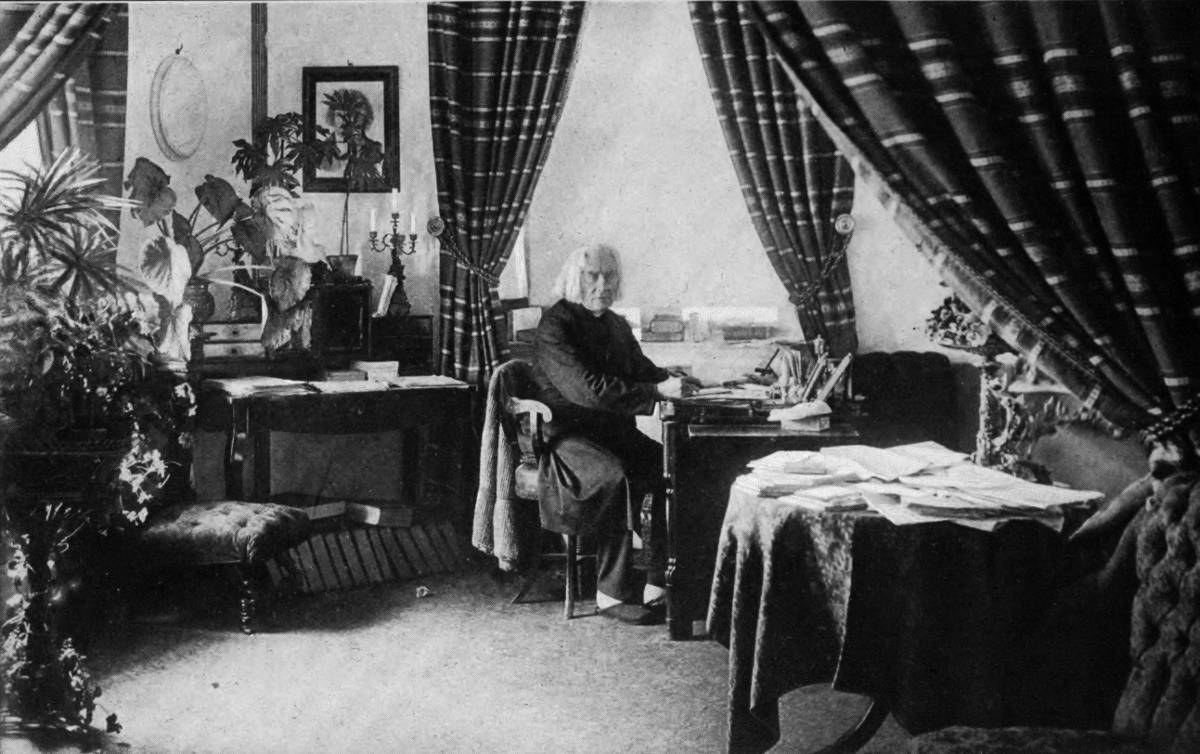 Intrigues pursued him in his capacity as court musical director. The Princess Maria-Pawlowna died June, 1859; the following October Princess Marie, daughter of Princess Sayn-Wittgenstein, married the Prince Hohenlohe, and Liszt, after the opera by Peter Cornelius was hissed, resigned his post. He remembered Goethe and his resignation, caused by a trained dog, at the same theatre. But he didn't leave Weimar until August 17, 1861, joining the princess at Rome. The scandal of the attempted marriage there is told in another chapter. Again the eyes of the world were riveted upon Liszt. His very warts became notorious. Some say that Cardinal Antonelli, instigated by Polish relatives of the princess, upset the affair when the pair were literally on the eve of approaching the altar; some believe that the wily Liszt had set in motion the machinery; but the truth is that at the advice of the Cardinal Prince Hohenlohe, his closest friend, the marriage scheme was dropped. When the husband of the princess died there was no further talk of matrimony. Instead, Liszt took minor orders, concentrated his attention on church music, and henceforth spent his year between Rome, Weimar, and Budapest. He hoped for a position at the Papal court analogous to the one he had held at Weimar; but the appointment of music-director at St. Peter's was[23] never made. To Weimar he had returned (1869) at the cordial invitation of the archduke, who allotted to his use a little house in the park, the Hofgärtnerei. There every summer he received pupils from all parts of the world, gratuitously advising them, helping them from his impoverished purse, and, incidentally, being admired by a new generation of musical enthusiasts, particularly those of the feminine gender. There were lots of scandals, and the worthy burghers of the town shook their heads at the goings-on of the Lisztianer. The old man fell under many influences, some of them sinister. He seldom saw Richard or Cosima Wagner, though he attended the opening of Bayreuth in 1876. On that occasion Wagner publicly paid a magnificent tribute to the genius and noble friendship of Liszt. It atoned for a wilderness of previous neglect and ingratitude.