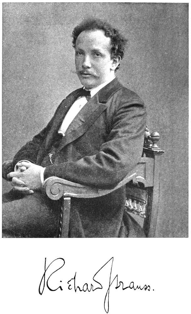 Richard Strauss was born at Munich, June 11, 1864. He is the son of Franz S. Strauss, formerly first horn player in the Bavarian Court Band. His father has written studies and other compositions for his instrument; and, as his son said, “he could play most of the instruments in the orchestra.” He sat under Wagner’s stick, but was not a Wagnerian. Once he played so well that Wagner exclaimed, “I fancy after all, Strauss, you cannot be such an anti-Wagnerian as they make out, for you play my music so beautifully.” “What has that got to do with it?” answered the stubborn artist. The mother of Richard was born Pschorr, and is a daughter of the wealthy Munich brewer. The boy received his first piano lessons at the age of four and a half from his mother. Later he studied with August Tombo, a harp player, and took up the violin under Benno Walter. At the age of six he composed a three-part song, a valse, and a polka—Schneider Polka, he called the dance. Before he went to school he had tried his hand[Pg 19] at songs, piano pieces, and an orchestral overture. Sent to the elementary schools from 1870 to 1874, the gymnasium from 1874 to 1882, and the university from 1882 to 1884, Strauss laid the foundation of a comprehensive culture, a catholicity in taste, a love of belles lettres, and a general knowledge of the world’s literature. He early mastered the technics of the piano and violin, and in 1875, with Kapellmeister Fr. W. Meyer, theory and composition. This course lasted five years. The composing went on apace. A chorus for the Electra of Sophocles and a festival chorus were given a hearing at a gymnasium concert. Three of his songs were sung in 1880; and in March, 1881, his string quartet in A, opus 2, the scherzo of which he wrote in his fifteenth year, was played by Benno Walter’s quartet, to whom it was dedicated. Four days later his first symphony was accorded a hearing under Hermann Levi, and the extreme youth of the composer called forth remonstrances. In 1883 Berlin heard his C minor overture under Radecke. Both are still in manuscript.