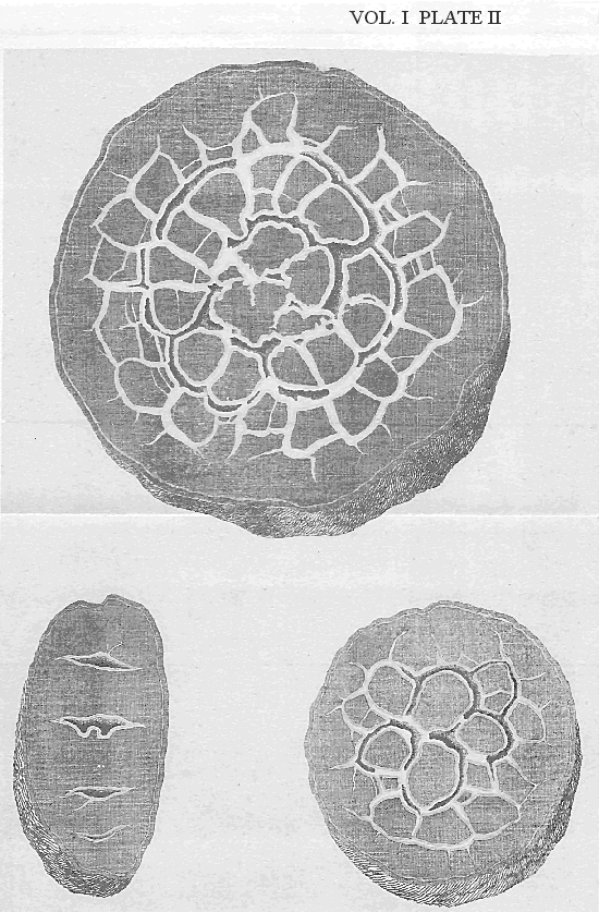 3dly, There are, in all the regions of the earth, huge masses of calcareous matter, in that crystalline form of sparry state, in which perhaps no vestige can be found of any organised body, nor any indication that such calcareous matter had belonged to animals; but as, in other masses, this sparry structure, or crystalline state, is evidently assumed by the marine calcareous substances, in operations which are natural to the globe, and which are necessary to the consolidation of the strata, it does not appear, that the sparry masses, in which no figured body is formed, have been originally different from other masses, which, being only crystallised in part, and in part still retaining their original form, leave ample evidence of their marine origin3.