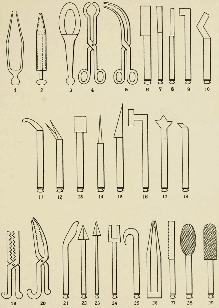 [12] The Ebers Papyrus shows that special attention was paid to diseases of the eyes, the nose, and throat, and we have traditions of operations upon these from very early times. Conservative surgery of the teeth, and the application of prosthetic dental apparatus, being rather cosmetic than absolutely necessary, might possibly be expected not to have developed until comparatively recent times; but apart from the traditions in Egypt with regard to this speciality, which are rather dubious, we have abundant evidence of the definite development of dentistry from the long ago. The old Etruscans evidently paid considerable attention to prosthetic dentistry, for we have specimens from the Etruscan tombs which show that they did bridge work in gold, supplied artificial teeth, and used many forms of dental apparatus. At Rome the Laws of the Twelve Tables (circa 450 B.C.) forbade the burying of gold with a corpse except such as was fastened to the teeth, showing that the employment of gold in the mouth for dental repair must have been rather common. We have specimens of gold caps for teeth from the early Roman period; and there is even a well-confirmed tradition of the transplantation of teeth, a practice which seems to have been taken up again in the later Middle Ages, and then allowed to lapse once more until our own time.