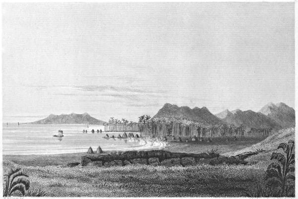 On the northeast of Hawaii lies a deep bay,[33] fringed with coral reefs, but in many places presenting high cliffs, precipitous masses of volcanic rock, rent by deep chasms, or forming valleys through which pour streams of fresh water along banks of surpassing fertility. Everywhere the soil is good and the vegetation profuse. Numerous cascades tumble from the hills in all directions, giving life and music to the scene. Some are mere threads of water lost in spray amid rainbow arches, before reaching the rocky basins underneath. Others shoot from precipices, waving, foaming torrents, which thunder over stream-worn rocks, far away beneath in sunless and almost inaccessible dells. Emerging from these into placid rivers, they flow quietly on till meeting the incoming surges of the ocean, which, as they struggle over the coral bars at their mouths, whiten their surfaces with foam and break into eddies and uncertain currents, creating trying navigation for the frail canoes of the islanders.