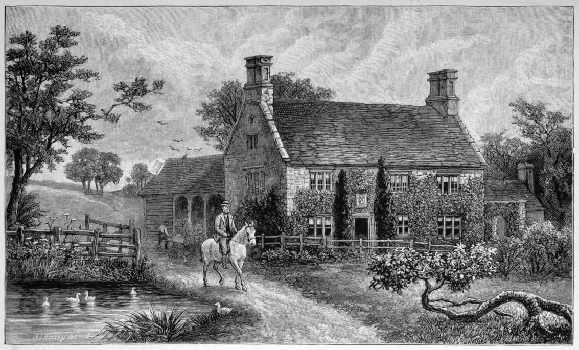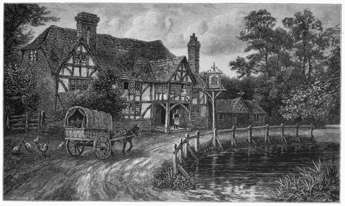 of Prince Houssain’s carpet of Arabian Nights renown, for by their aid not only were we quickly transported to the distant shires, but we also turned back the hand of Time to the genial summer days, and, in spirit, were soon far away repeating our past rambles, afoot and awheel, along the bracken-clad hillsides, over the smooth-turfed Downs, and across the rugged, boulder-strewn moors, here purple with heather and there aglow with golden gorse; anon we were strolling alongside the grassy banks of a certain quiet gliding river beloved of anglers, and spanned, just at a point where an artist would have placed it, by a hoary bridge built by craftsmen dead and gone to dust long centuries ago. Then, bringing forcibly to mind the old beloved coaching days, came a weather-stained hostelry with its great sign-board still swinging as of yore on the top of a high post, and bearing the representation—rude but effective—of a ferocious-looking red lion that one well-remembered summer evening bade us two tired and dust-stained travellers a hearty heraldic welcome. Next we found ourselves wandering down a narrow valley made musical by a little stream tumbling and gambolling over its rocky bed (for the sketches revealed to the mind infinitely more than what the eye merely saw, recalling Nature’s sweet melodies, her songs without words, as well as her visible beauties; besides raising within one countless half-forgotten memories)—a stream that turned the great green droning wheel of an ancient water-mill, down to which on either hand gently sloped the wooded hills, and amidst the foliage, half drowned{4} in greenery, we could discern at irregular intervals the red-tiled rooftrees of lowly cottage homes peeping picturesquely forth. Then we were transported to an old, time-grayed manor-house of many gables and great stacks of clustering chimneys, its ivy-grown walls and lichen-laden roof being backed by rook-haunted ancestral elms; the ancient home, with its quaint, old-fashioned garden and reed-grown moat encircling it, seemed, when we first came unexpectedly thereon, more like the fond creation of a painter or a poet than a happy reality.