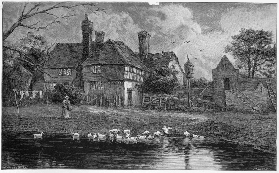 “What a capital time,” I exclaimed, “to look over some of the sketches we made during our last summer holiday; they will help us to recall the long sunny days, those jolly days we spent in the country, and bring back to mind many a pleasant spot and picturesque old home!” No sooner was the idea expressed than I sought out sundry well-filled sketch-books from the old oak corner cupboard devoted to our artistic belongings. True magicians were those sketch-books, with a power superior even to that{3}