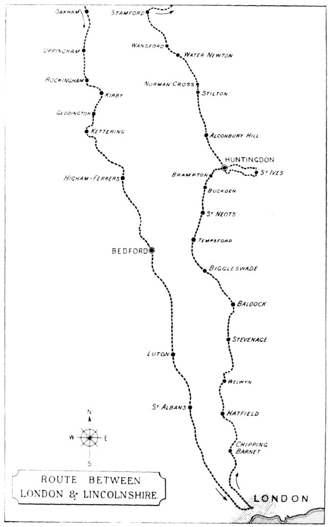 | Memorial of a great battle—An ancient fire-cresset—Free feasting!—Country quiet—Travellers’ Tales—Hatfield—An Elizabethan architect—An author’s tomb—Day-dreaming—Mysterious roadside monuments—Great North Road versus Great Northern Railway—Stevenage—Chats by the way—Field life—Nature as a painter—Changed {xii}times | 21 |