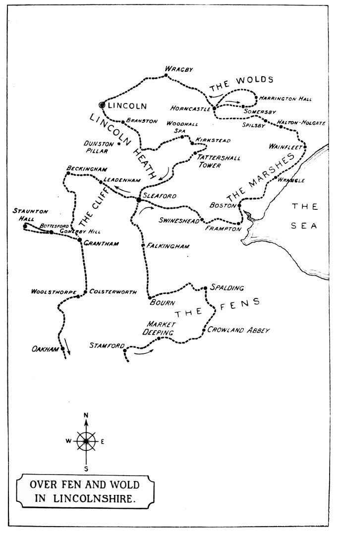The following pages contain the chronicle of a leisurely and most enjoyable driving tour through a portion of Eastern England little esteemed and almost wholly, if not quite, neglected by the average tourist, for Lincolnshire is generally deemed to be a flat land, mostly consisting of Fens, and with but small, or no scenic attractions. We, however, found Lincolnshire to be a country of hills as well as of Fens, and we were charmed with the scenery thereof, which is none the less beautiful because neither famed nor fashionable. Some day it may become both. Lincolnshire scenery awaits dis{viii}covery! Hitherto the pleasure-traveller has not found it out, but that is his loss!