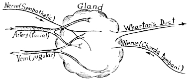 It is quite necessary to remember that the simple reflex is really a process of much complexity and may involve many other parts and structures than those to which we immediately direct our attention. But leaving aside these qualifications we may usefully consider the general characters of the reflex, regarding it as a common, automatically performed, restricted bodily action, involving receptor organ, central nervous organ, and effector organ. There are certain kinds of external stimuli that continually affect our organs of sense, and there are certain kinds of muscular and glandular activity that occur “as a matter of course,” when these stimuli fall on our organs of sense. The emanation from onions or the vapour of ammonia causes our eyes to water; the smell of savoury food causes a flow of saliva; and anything that approaches the face very rapidly causes us to close the eyes. Reflexes are, in a way, commonly occurring, purposeful and useful actions, and their object is the maintenance of a normal condition of bodily functioning.