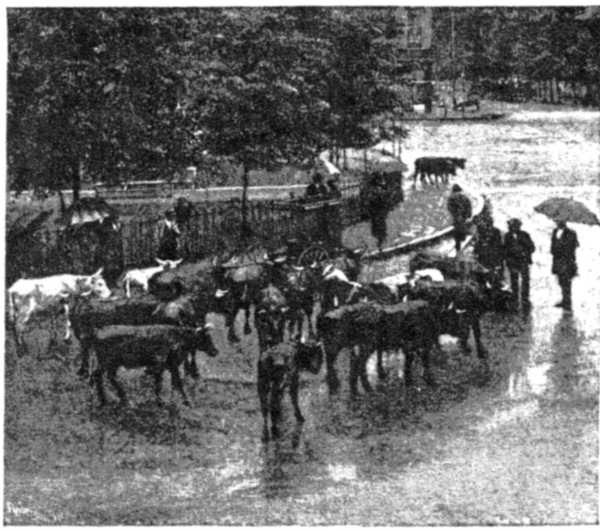 As I stood one day in this valley, which has already begun to put on the air of civilization, with its hotel and railway station and mills and pretty hometeads, [300] I saw a sight which seemed to me a complete epitome of the past and present tendencies there at work—a summing up of the past and a prophecy of the future. Creeping slowly past the station—so slowly that one knows not what to compare it to unless it be the minute-hand on the dial of a clock—creeping slowly along the Wilderness Road towards the ascent of Cumberland Gap, there came a mountain wagon, faded and old, with its dirty ragged canvas hanging motionless, and drawn by a yoke of mountain oxen which seemed to be moving in their sleep. On the seat in front, with a faded shovel-hat capping his mass of coarse tangled hair, and wearing but two other garments—a faded shirt and faded breeches—sat a faded, pinched, and meagre mountain boy. The rope with which he drove his yoke had dropped between his clasped knees. He had forgotten it; there was no need to remember it. His starved white face was kindled into an expression of passionate hunger and excitement. In one dirty claw-like hand he grasped a small paper bag, into the open mouth of which he had thrust the other hand, as a miser might thrust his into a bag of gold. He had just bought, with a few cents, some sweetmeat of civilization which he was about for the first time to taste. I sat and watched him move away and begin the ascent to the pass. Slowly, slowly, winding now this way and now that across the face of the mountain, now hidden, now in sight, [301] they went—sleeping oxen, crawling wagon, starved mountain child. At length, as they were about disappearing through the gap, they passed behind a column of the white steam from a saw-mill that was puffing a short distance in front of me; and, hidden in that steam, they disappeared. It was the last of the mountaineers passing away before the breath of civilization.