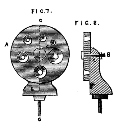 There are, in addition to the flange and pointed centre, other pieces of apparatus that can be substituted, as occasion may require, and these will be hereafter described in this series. With regard to the common rest for hand turning a lengthened description is unnecessary. The T or tee should for wood turning be of the form shown in Fig. 6 at A. It is often made as B, which is a very inconvenient pattern, as the cross piece on which the tool rests cannot be advanced sufficiently close to the work if the latter exceeds a diameter of two or three inches. For metal turning the top of the rest should be flat, and about one inch broad, as the heel of the hook tools used for turning iron must be able to take a firm bearing upon its surface. Sometimes a plate of brass is riveted on the flat top, as the tool takes a firmer hold on this metal, and when the latter becomes defaced and channelled it can be renewed without the cost of a new casting in iron. The turner should be provided with two or three tees for metal and for wood,—one may be long enough to have two legs and require[5] two sockets, as shown at C. This is convenient in turning long pieces of wood,—a very short tee, not more than an inch in length, should also be provided, and if one tee is specially kept with a very level and smooth edge, it will be found of great advantage in chasing screws—indeed the latter work can hardly be managed at all if the top of the rest is damaged and uneven. The next part requiring description is the boring collar, without which even a hand turning lathe can hardly be considered complete. This boring collar is intended so to support one end of the work, instead of its being held by the back centre, as to enable the workman to get at the end of it for the purpose of drilling it. Suppose for instance the work in hand is a tool handle, and that it is so far finished as only to require the hole for the reception of the tang of the tool. If this is bored by hand with a gimlet, it is seldom that the hole will be truly in the axis of the piece, but when this is done in the lathe by the help of the boring collar the bore will be truly central, and the tool when in place will fall in the same line with the handle. This will conduce to the correctness of the work in hand more than the amateur or other workman might suppose, and a row of tools thus truly handled and in good condition generally bespeaks an efficient and careful artisan. There are several plans for boring collar of nearly equal efficiency, and we shall describe one or two of the most common, and also one invented by the author, and which, if carefully made, is of great service. Fig. 7 represents a poppet head, B, which is but half the height of the other poppets of the lathe—a side view of this is shown at B, Fig. 8. Near the top of this poppet is a hole through which passes a bolt C, by which and its nut the circular plate A can be securely clamped in any desired position, as it revolves freely on the bolt as a centre pin. This plate is bored with a series of conical holes, which are so arranged that their respective centres will be in a line with the centres of the mandrel when any one of them is brought into a position corresponding with the line c, c. The hole thus brought into position for use (having been selected according to the size of the work to be bored), takes the place of the back centre; the end of the work rests in the cone, which is greased or soaped to reduce friction, and the rest being fixed at the other side of the boring collar, the drill can be readily used, and the bore afterwards enlarged if necessary with any convenient tool. This boring collar is generally made of iron, but a substitute of hard wood will[6] frequently serve the purpose, and can be made by the amateur, who may be unable to obtain one of more durable material. If made of wood the best unguent will be soap or black lead, such as is used for grates, or a mixture of the two. This black lead or plumbago (it has no lead in its composition) will always be found serviceable where wood works upon wood, and also to give a smooth surface to wooden patterns for casting.