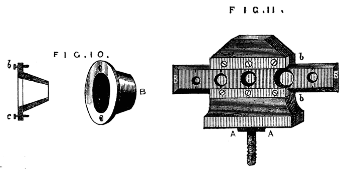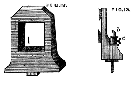 The second modification is more difficult to make, but equally effective. It is shown complete in Fig. 11. This form, arranged by[7] the writer, has many advantages over the two last-named, and is very serviceable. A is the poppet, of the full height of the ordinary lathe heads, or a couple of inches higher. B, the slide forming the support of the piece to be bored. The form of the poppet without this attachment is shown in Fig. 12. If for nice work it should be made of metal and the face of it planed, but for general purposes hard wood will suffice. b, b, Fig. 11, are two pieces of brass forming a groove or guide in which a slide B, with dovetailed edges is fitted to work. This slide is bored, like the ordinary collar, with conical holes of different sizes, and should be made of metal and planed on back and edges. Over each hole is a mark, and this is to be brought to a similar mark on the face of the poppet. The plate is then clamped in position by a screw at the back of the poppet. One or more of such slides may be fitted at pleasure, and in case of wear or damage these are the only parts requiring to be renewed.