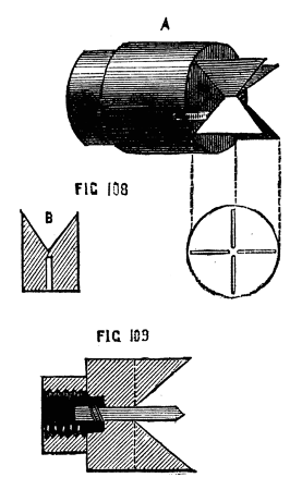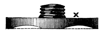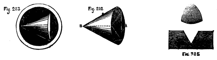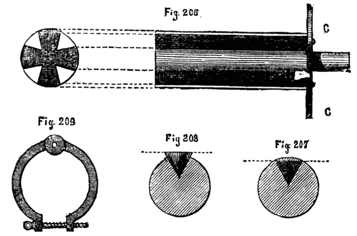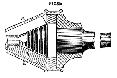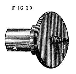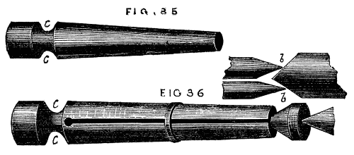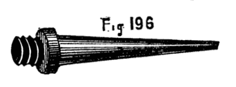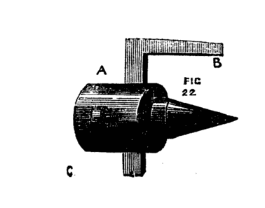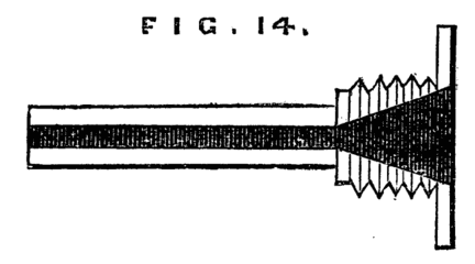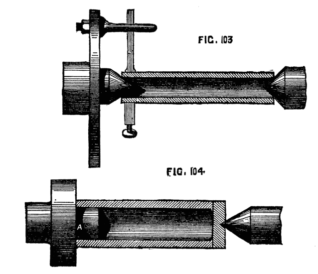 This consists in making such a guide cone as mentioned and shown in Fig. 10, B, but with a continuation containing a smaller hole for the drill, as Fig. 14. Both this and the other shorter cones above-mentioned may be made to screw into the poppet A, [8]Fig. 9, instead of being kept in place by the pins at a, a, of that figure. In that case however the hole in the poppet must be cylindrical and only used as a support for the cones themselves. In addition to the use of these boring collars already alluded to, they serve for the purpose of turning up the points of screws like those of lathe centres. These are first formed between centres with carrier chuck, the back poppet is then removed and the extreme point fitted through one of the holes of the boring collar and the marks of the centre turned off.
