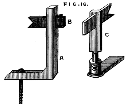 Another useful adjunct to the lathe is the back rest for supporting long and slender articles, which would otherwise bend under the pressure of the tool. The ordinary and simplest form is shown in Fig. 15, and this is of general use with brush handle makers and others whose work is confined to a few sizes and shapes only. A better form is shown in Fig. 16. A support of wood or metal shaped like A is clamped to the lathe bed. Through the upper part the slide B passes and is wedged up so as to support the work—or the socket of a lathe rest may be arranged to take the upright part A, which must then be rounded, as shown at C.