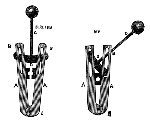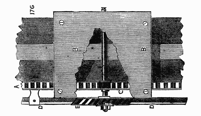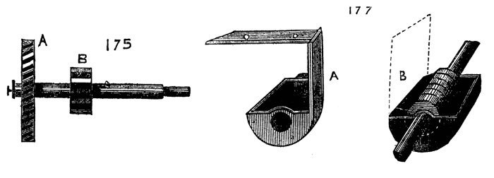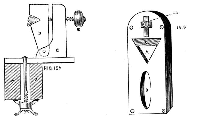 A modification of the latter, communicated to the English Mechanic, is shown in Fig. 16A. Its construction and mode of application is sufficiently evident without a detailed description. Fig. 16B is another form made in metal. It consists of two similar plates with a triangular opening A, through which the work is passed, and which has an oval slot D, by which the apparatus is secured to the short poppet of the boring collar. Between the two plates slides a third, partly visible at C, which can be clamped by a screw at B, this screw also serving as a stud by which the plate may be moved. The work is allowed to take up its own bearing in the triangular opening as it revolves in the lathe. The clamping screw of the poppet is then secured, and the centering thus made certain. The plate C is then made to descend so as to touch the work, and[9] clamped in that position. This is a very good central support for long slender articles.