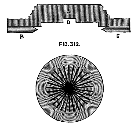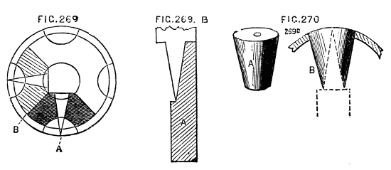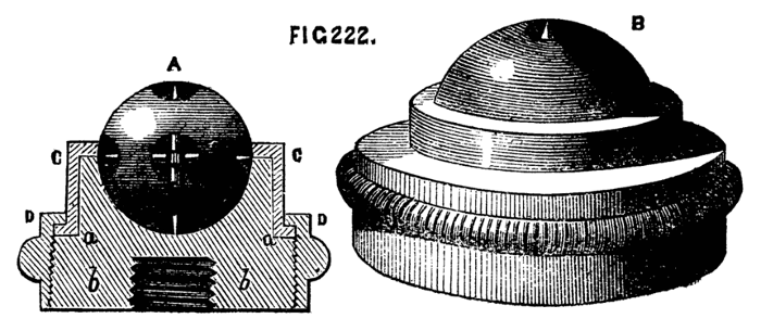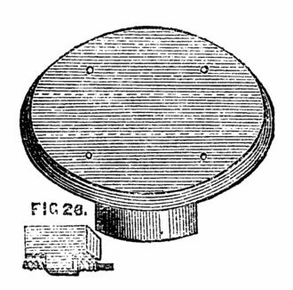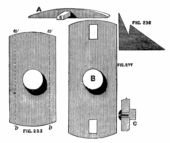 Where cost is an object, a simple substitute for the boring collar is frequently made by the ordinary workman by a piece of board one inch thick, shaped like Fig. 9, with a single hole of the size most generally required; and the work is then fitted to the boring collar, instead of the latter to the work. In turning tool handles, for instance, where a few dozen are required all of the same size, or nearly so, a device of this kind, which can be made in a few minutes, is sufficiently effective. This form has been modified in two ways, and either will be found convenient. In the first, the conical hole is made of the largest size likely to be required, a set of boxwood plugs are then turned to fit this hole and are themselves bored in a similar way to suit various sizes of work. The form of these plugs is shown in Fig. 10, which is a side sectional view, and at B, where the same is shown in perspective. Two small screws or pins b, c, Fig. 10, fitting into the holes a, a, Fig. 9, prevent these flange-shaped plugs from turning round in the board as the work revolves. The pattern of A, Fig. 9, may be varied, and is better made of hard wood, and of a form which will afford a good bearing upon the lathe bed.