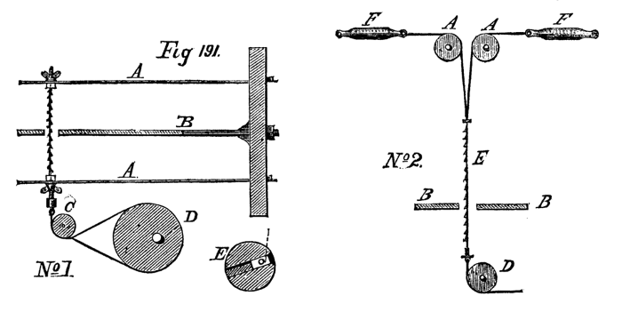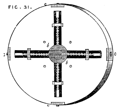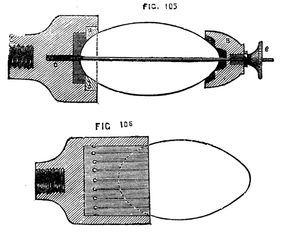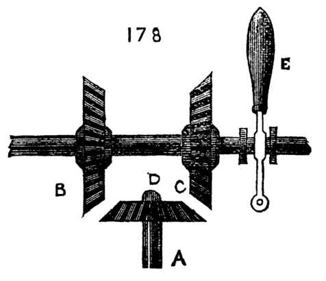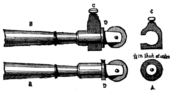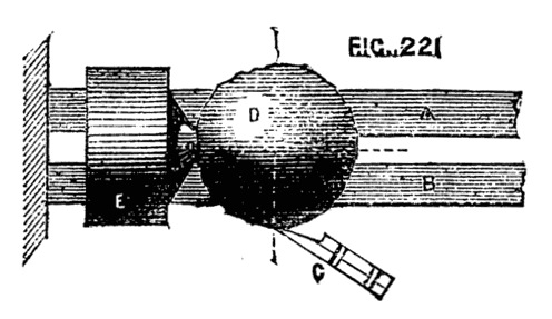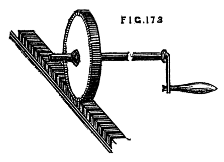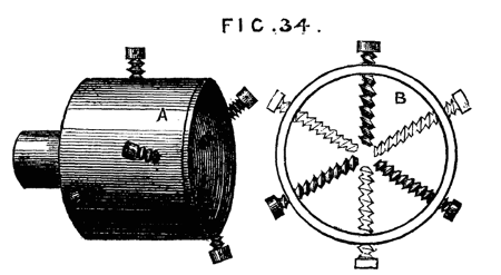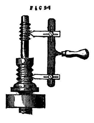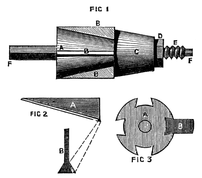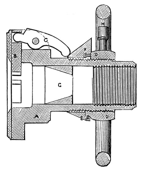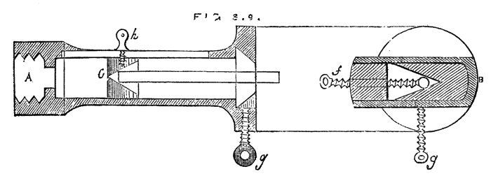 It is evident that by turning the wheel the internal screw is put in revolution, and as it is prevented by its flange from assuming any motion in the direction of its length, the movable cylinder will instead be withdrawn or thrust forward.
