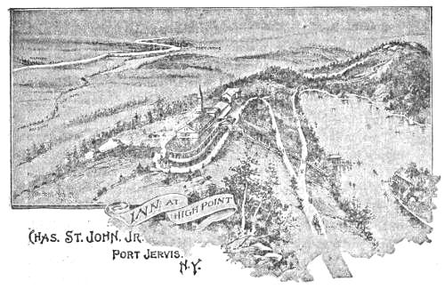Page 6.—High Point. Is situated in Sussex Co., 5½ miles southeast of Port Jervis, and is the most elevated land in the State of New Jersey, being 1804 feet above the level of the sea and 1395 feet above the Delaware Valley at Tri-States Rock. From its peak twenty-seven cities and villages can be seen. The scenery is grand and sublime. Extending north to the Catskills, south to the Water Gap, east to the Highlands and west across the Delaware, Neversink and Mamakating Valleys; while the pure air from the pine forests of Sullivan County drives the malaria and mosquitoes toward the Atlantic. It is crowned by a beautiful lake, supplied by pure crystal spring water, and a first-class hotel, where the wants of the inner man can be supplied.