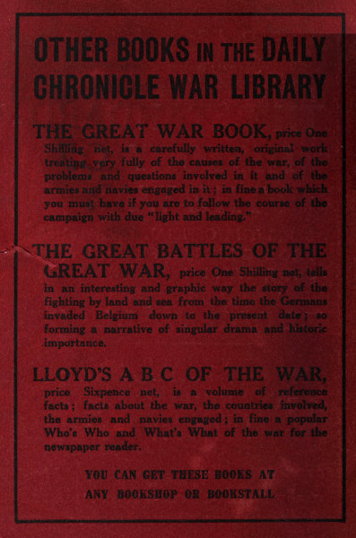 What most of us feel here is that the Germans are staking everything on fighting in France or Belgium, and when they are beaten, as they will be sooner or later, they will howl for peace to save their own country from the horrors of invasion. That’s an idea we have got from their prisoners, and they think it’s a rattling good one. If it were left to the army to settle you may be sure that we’d vote to a man for giving the devils a taste of their own medicine, and you’ll see us crossing their sacred Rhine before long unless you’re the greatest fools in creation. You are only a woman and can’t vote, but for Heaven’s sake rub it in to all the men you know that this is what the army feels about the thing. We wouldn’t make peace with the devils until we’ve rubbed their noses well into the ground of their Fatherland, and we’ll do it yet, even if it costs us a million lives: Lance-Corpl. S. Northcroft, of Wolverhampton.