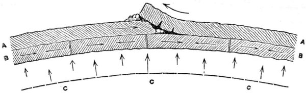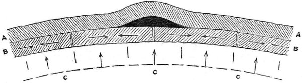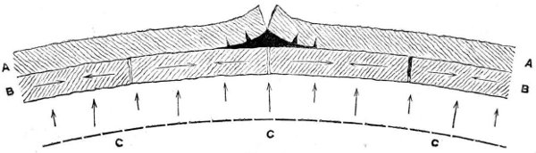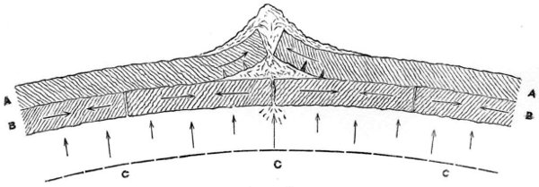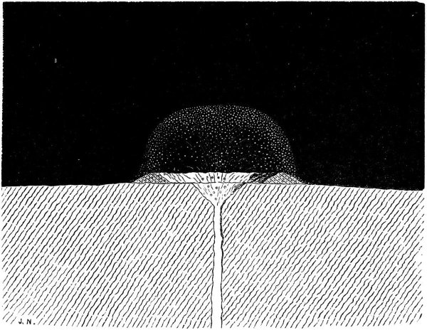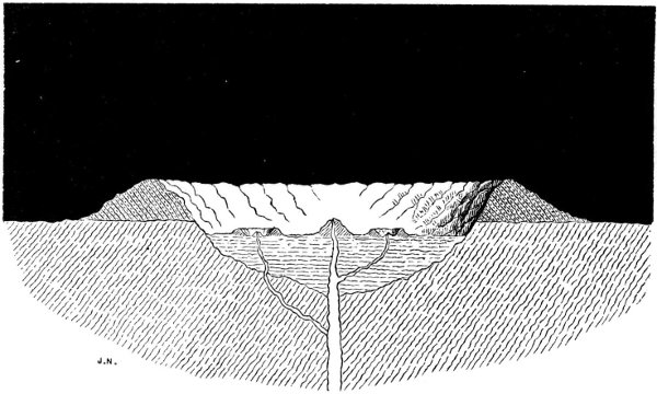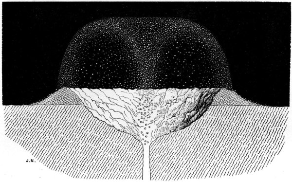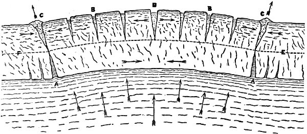 The incandescent sphere having attained its maximum degree of heat by the total conversion thereinto of the gravitating force it embodied, we explained how there must have ensued a dispersion of that heat by radiation into surrounding space, resulting in the cooling and consequent solidification of the outermost stratum of the lunar sphere, and subsequently in the continuation of the cooling process downwards or inwards to the centre. And here we essayed to prove that in this second stage of the cooling process, when the crust was solid and the subjacent portion of the molten sphere was about to solidify, there would come into operation a principle which appears to govern the behaviour of certain fusible substances, and which may be concisely termed the principle of pre-solidifying expansion. We adduced several examples of the manifestation of this principle, soliciting for it the careful consideration of physicists and geologists, and looking to it as furnishing the key to the mystery of volcanic action upon the moon, since, without needing recourse to aqueous or gaseous sources of eruptive power, it afforded a rationale of the ejection of the fluid and semifluid matter of the moon through the solidified crust thereof, and also of the dislocations of that crust, unattended by actual ejection of subsurface matter, of which our satellite presents a variety of examples, and which the earth also appears to have experienced at some period of its formative history.