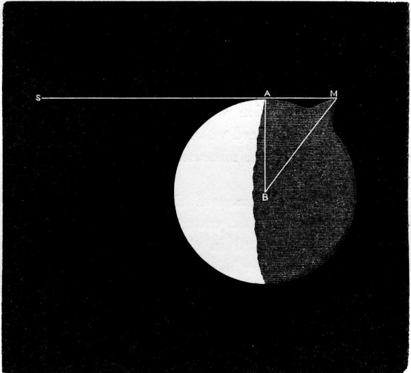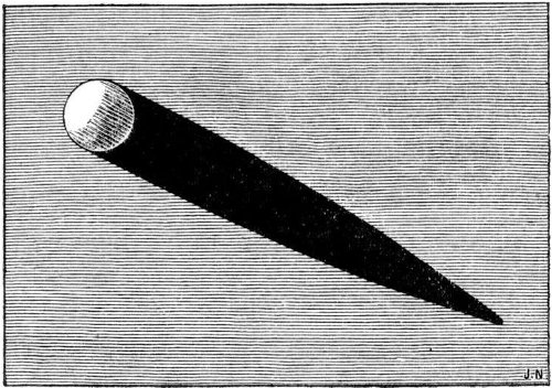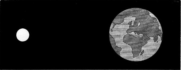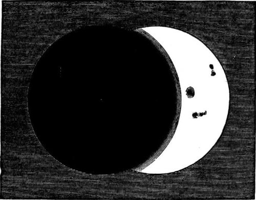 It might happen at “full-earth,” that a black spot with a fainter penumbral fringe would appear on one side of the illuminated disc and pass somewhat rapidly across it. This would occur when the moon passed exactly between the sun and the earth, and the shadow of the moon was cast upon the terrestrial disc. We need hardly say that these shadow-transits would occur upon those astronomically important occasions when an eclipse of the sun is beheld from the earth.