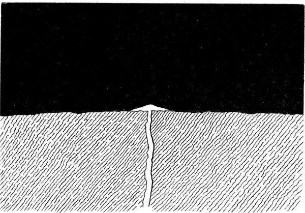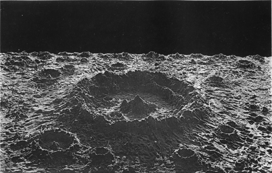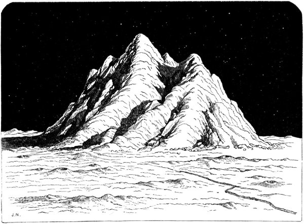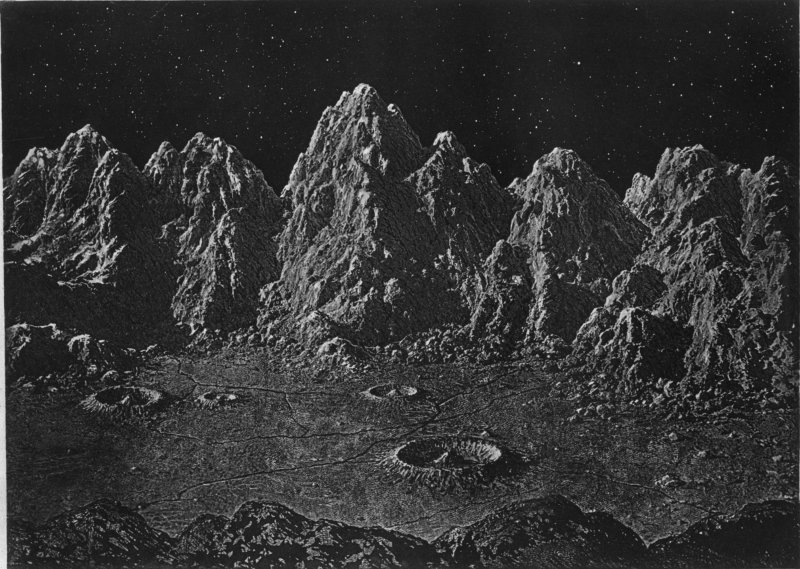The lunar landscape by night needs little description: it would be lit by the earth-moon sufficiently to allow salient features, even at a distance, to be easily made out, for its moon (i.e. the earth) has thirteen times the light-reflecting area that our’s has. But the night illumination will change in intensity, since the earth-moon varies from half-full to full, and again to half-full, between sunset and the next sunrise. The direction of the light, and hence the positions of the shadows, will scarcely alter on account of the apparent fixity of the earth in the lunar sky. A slight degree of warmth might possibly be felt with the reflected earth-light; but it would be insufficient to mollify the intensity of the prevailing cold. The heat accumulated by the ground during the three hundred hours’ sunshine radiates rapidly into space, there being no atmospheric coat to retain it, and a cooling process ensues that goes on till, all warmth having rapidly departed, the previously parched soil assumes a temperature approaching that of celestial space itself, and which has been, as we have stated, estimated at about 200° below the Fahrenheit zero. If moisture existed upon the moon, its night-side would be bound in a grip of frost to which our Arctic regions would be comparatively tropical. But since there is no water, the aspect of the lunar scenery remains unmodified by effects of changing temperature.