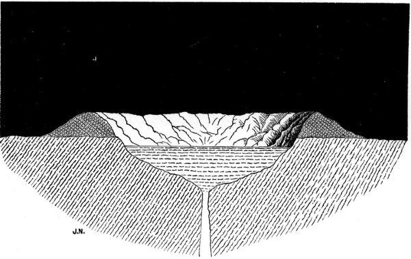 These descriptive matters disposed of, we proceeded to discuss the various classes of surface features with a view to explaining the precise actions which appear to us to have led to their formation. Naturally the craters first demanded our attention. We pointed out the reasons for regarding the great majority of the circular formations of the moon as craters, as truly volcanic as those of which we have examples, modified by obvious causes, upon the earth; and, tracing the causative phenomena of terrestrial volcanoes, we showed how the explanations which have been offered to account for them scarcely apply to those of the moon: and thus, driven to other hypotheses, we endeavoured to demonstrate the probability of the lunar craters having been produced by eruptive force, generated by that pre-solidifying expansion of successive portions of the moon’s molten interior, which we enunciated in our third chapter. The precise course of phenomena which resulted in the production of a crater of the normal lunar type, with or without the significant central cone, were then illustrated by a series of step-by-step diagrams with accompanying descriptive paragraphs. And after treating of craters of the normal type we pointed out and explained some variations thereupon that are here and there to be met with, and likewise those curious complications of arrangement which exhibit craters superimposed one upon another and intermingled in strange confusion.