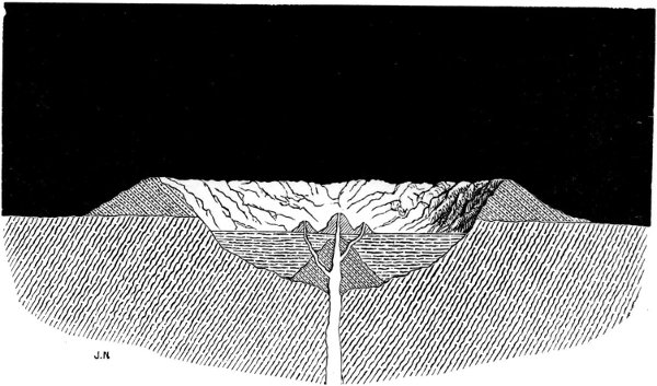 Looking again, after some hours’ interval, into the great crateral amphitheatre, we see that the rays of the morning sun have crept down the distant side of the rampart, opposite to that on which we stand, and lighted up its vast landslipped terraces into a series of seeming hill-circles with all the rude and rugged features of a terrestrial mountain view, and none of the beauties save those of desolate grandeur. The plateau of the crater is half in shadow 10,000 feet below, with its grand group of cones, now fully in sight, rising from its centre. Although these last are twenty miles away and the base of the opposite rampart fully double that distance, we have no means of judging their remoteness, for in the absence of an atmosphere there can be no aërial perspective, and distant objects appear as brilliant and distinct as those which are close to the observer. Not the brightness only, but the various colours also of the distant objects are preserved in their full intensity; for colour we may fairly assume there must be. Mineral chlorates and sublimates will give vivid tints to certain parts of the landscape surface, and there must be all the more sombre colours which are common to mineral matters that have been subjected to fiery influence. All these tints will shine and glow with their greater or less intrinsic lustres, since they have not 166 been deteriorated by atmospheric agencies, and far and near they will appear clear alike, since there is no aërial medium to veil them or tarnish their pristine brightness.