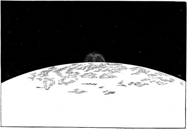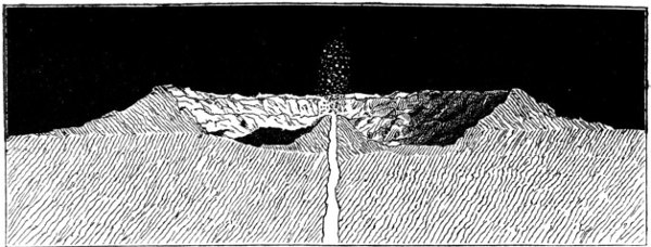 And with no air there can be no diffusion of light. As a consequence, no illumination reaches those parts of the scene which do not receive the direct solar rays, save the feeble amount reflected from contiguous illuminated objects, and a small quantity shed by the crescent earth. The shadows have an awful blackness. As we stand upon our chosen point of observation, we see on the lighted side of the rampart almost dazzling brightness, while beneath us, on the side away from the sun, there is a region many miles in area impenetrable to the sight, for there is no object within it receiving sufficient light to render it discernible; and all around us, far and near, there is the violent contrast between intense brightness of insolated parts and deep gloom of those in equally intense shadow. The black though starlit sky helps the violence of this contrast, for the bright mountains in the distance around us stand forth upon a background formed by the darkness of interplanetary space. The visible effects of these conditions must be in every sense unearthly and truly terrible. The hard, harsh glowing light and pitchy shadows; the absence of all the conditions that give tenderness to an earthly landscape; the black noonday sky, with the glaring sun ghastly in its brightness; the entire absence of vestiges of any life save that of the long since expired volcanoes—all these conspire to make up a scene of dreary, desolate grandeur that is scarcely conceivable by an earthly habitant, and that the description we have attempted but insufficiently pourtrays.