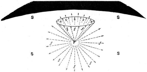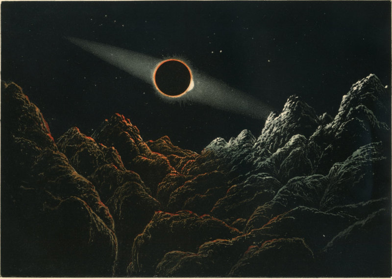 During the early stages of the eclipse, this chaplet of brilliant-coloured lights would be brightest upon the side of the disappearing sun; at the time of central eclipse the radiance (supposing the sun to pass centrally behind the earth) would be equally distributed, and during the later stages it would preponderate upon the side of the reappearing sun. We 164 have endeavoured to give a pictorial realization of this phenomenon and of the effect of the eclipse upon the lunar landscape, but such a picture cannot but fall very, very far short of the reality. (See Plate XXII.)