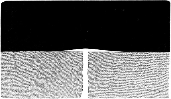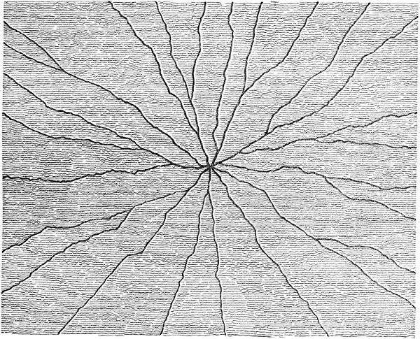 - Description—Divergence from Focal Craters—Experimental Explanation of their Cause—Radial Cracking of Crust—Outflow of Matter therefrom—Analogy from “Starred” Ice—No Shadows cast by Streaks—Their probable Slight Elevation—Open Cracks—Great Numbers—Length—Depth—In-fallen Fragments—Shrinkage a Cause of Cracks—Lateness of their Production
