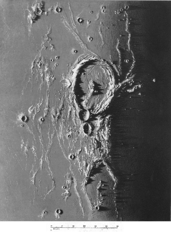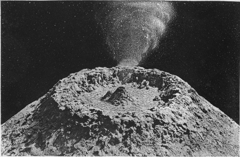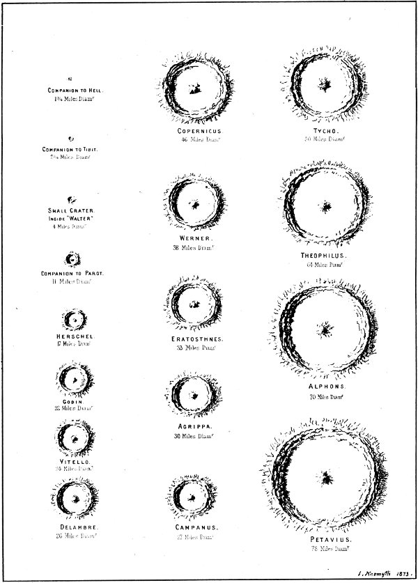 - Use of term Crater for Terrestrial and Lunar Formations—Truly Volcanic Nature of Lunar Craters—Terrestrial and Lunar Volcanic Areas compared—Similarity—Difference only in Magnitude—Central Cone—Found in great and small Lunar Craters—Formative Process of Terrestrial Volcanoes—Example from Vesuvius—Vast Size of Lunar Craters—Reasons assigned—Origin of Moon’s Volcanic Force—Aqueous Vapour Theory untenable—Expansion upon Solidification Theory—Formative Process of a Lunar Crater—Volcanic Vent—Commencement of Eruption—Erection of Rampart—Hollowing of Crater—Formation of Central Cone—Of Plateau—Various Heights of Plateaux—Coneless Craters—Filled-up Craters—Multiple Cones—Craters on Plateau—Double Ramparts—Landslip Terraces—Rutted Ramparts—Overlapping and Superposition of Craters—Source-Connection of such—Froth-like Aggregations of Craters—Majestic Dimensions of Larger Craters