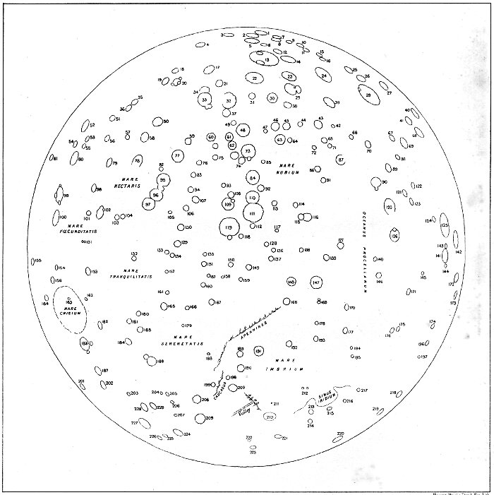 - Reasons for Mapping the Moon—Early Maps—Labours of Langreen—Hevelius—Riccioli—Cassini—Schroeter—Modern Maps—Lohrman’s—Beer and Maedler’s—Excellence of the last—Measurement of Mountain Heights—Need of a Picture Map—Formation of our own—Skeleton Map—Table of conspicuous Objects—Descriptions of special Objects—Copernicus—Gassendi—Eudoxus and Aristotle—Triesnecker—Theophilus, Cyrillus, and Catharina—Thebit—Plato—Valley of the Alps—Pico—Tycho—Wargentin—Aristarchus and Herodotus—Walter—Archimedes and the Apennines