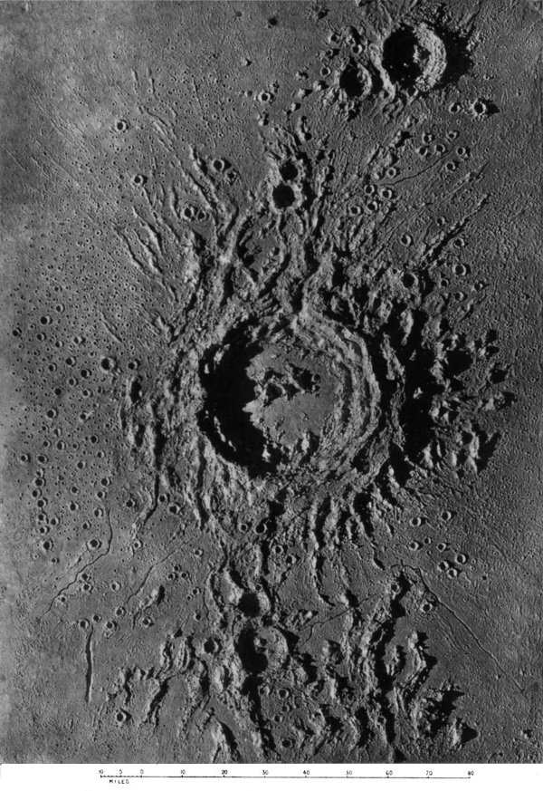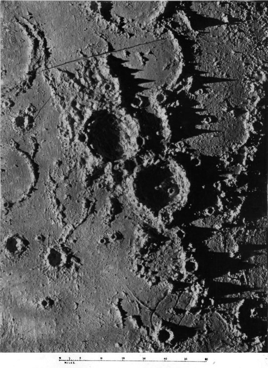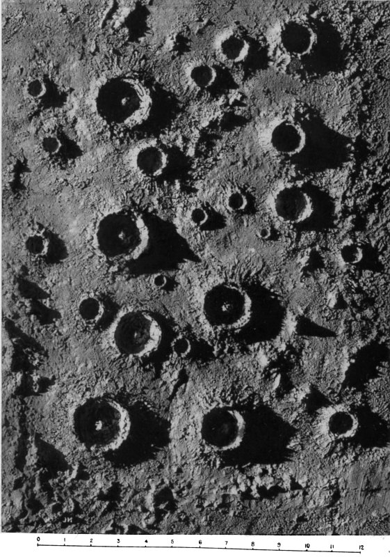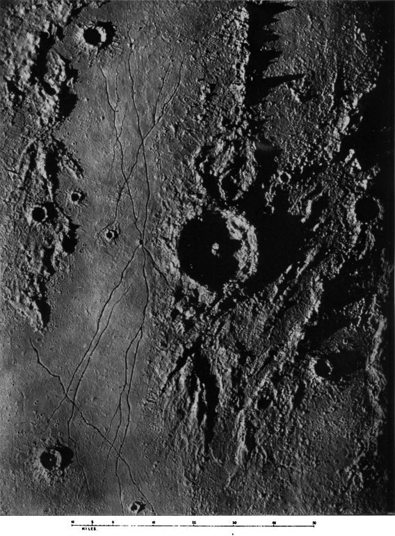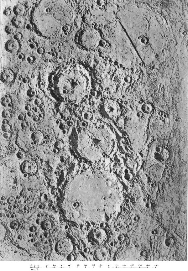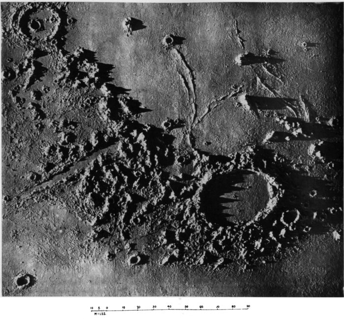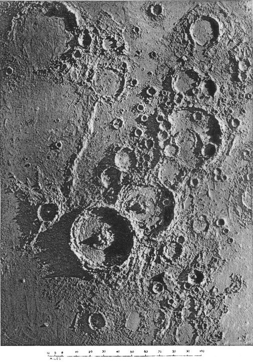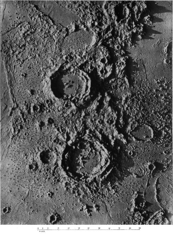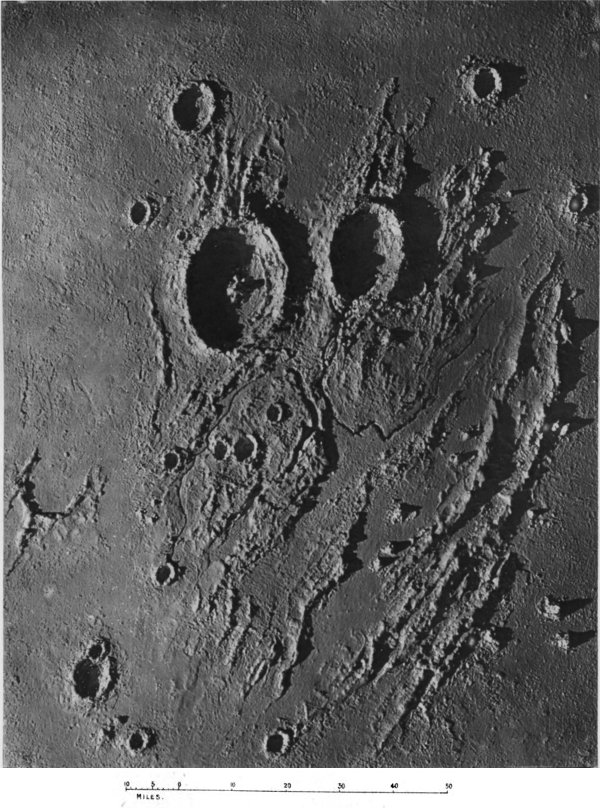 From craters manifestly volcanic we passed to the consideration of those circular formations which, from their vastness of size, scarcely admit of satisfactory explanation by a volcanic hypothesis. We summarized several proffered theories of their origin, and pointed out what we considered might be a possible key to the solution of the selenological enigma which they constitute, without, however, expressing ourselves entirely 187 satisfied with the validity of our suggestion. The less mysterious features presented by peaks and mountain ranges were then discussed to the extent that we considered requisite, viewing their comparatively simple character and the secondary position they occupy in point of numerical importance upon the moon. At greater length we dealt with the cracks and chasms and the allied phenomena of radiating streaks, pointing out with regard to these latter the strikingly beautiful correspondence in effect (and therefore presumably in cause) between them and crack-systems of a glass globe “starred” by an expanding internal medium.