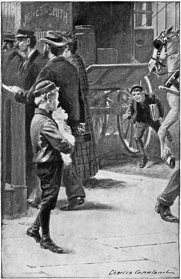 Master Chandler shook his head doubtfully, and appeared to be on the point of indulging some disparaging remark, when his attention was diverted by a lad on the opposite side of the street, who was making the most frantic gestures, and, as might be guessed by the movement of his lips, shouting at the full strength of his lungs; but the words were drowned by the rattle of vehicles and other noises of the street.