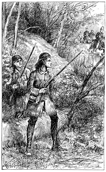 Where they stood the forest was open and free from underbrush, therefore while the troopers were yet a quarter of a mile away they were in full view, their red coats showing in vivid contrast among the green leaves, and before the advance squad were yet arrived at where the boys were standing, the entire company could be seen. 10