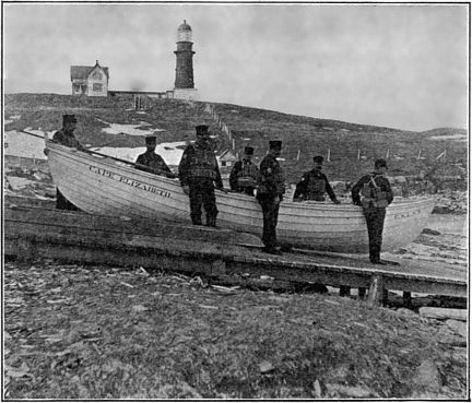 “The life-saving stations on the Atlantic seaboard are now within an average distance of five miles of each other, each crew consisting of a keeper and six surfmen. At sunset two men start from each station, one going to the right and the other to the left. They are equipped with lanterns and Coston signals, and each pursues his solitary and perilous way through the soft sand, in spite of flooding tides, bewildering snowfalls, overwhelming winds, and bitter cold....