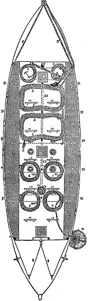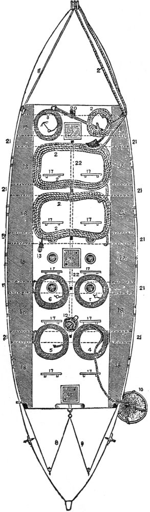 DECK-PLAN OF A SELF-RIGHTING LIFE-BOAT, SHOWING THE MANNER IN WHICH THE GEAR IS STOWED.