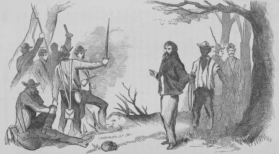 At these headquarters, I met an old scout and friend, named McIntyre, who went five or six miles with me—a man from the escort accompanying us to take back the horse I rode. We parted, and they returned to the camp, while I directed my steps through the woods toward Kenansville, and the reader may be sure I had a long, hard tramp. My orders were to go to Faison's Depot, on the railroad, between Wilmington and Goldsboro, where General Scofield expected that General Sherman would be the next Sunday; and it was a difficult job to get[389] through, as the rebels had the bridges and creek crossings all picketed. I had, sometimes, to go four or five miles out of my way to get across streams. At one point, about sixteen miles from Faison's, I wanted something to eat, and went to a negro cabin some distance from the road to get it; and while I was there, one of our soldiers went down the road on about the fastest horse, ever I saw a soldier ride; and he was making it do its best, while close behind him were about twenty Johnnies, in full pursuit, I soon saw, however, that the Yankee was bound to be winner, for his horse could out run every thing the Johnnies had. It was a pretty race, as long as I could see it; and when the party was out of sight, I took to the woods. Fortunately I did not travel far, till I discovered two horses tied to a tree, and I at once made a fair "divide" with the owner—I took one and left him the other; of course exercising my privilege of first choice. At the first house I passed I borrowed a saddle, and from there made good time, going at a run till I overtook the General. He had left the depot, and was already several miles away; and judging from the roar of artillery, was up to his eyes in a fight. Following the direction of the heaviest sound, I kept on, and found the General, as I expected, trying to force the Johnnies into a decent submission to the laws of the country. He was on the march with the 15th corps, when I overtook him, and delivered my dispatches.