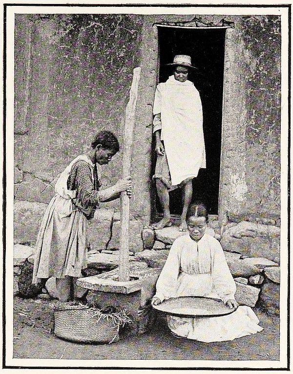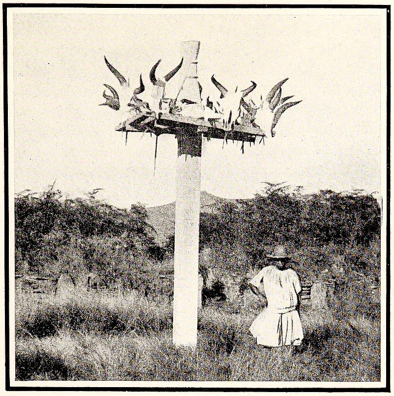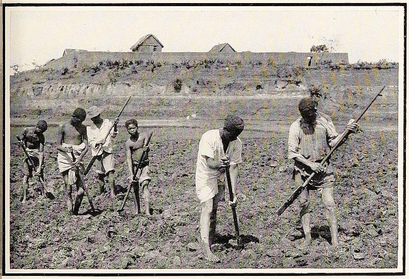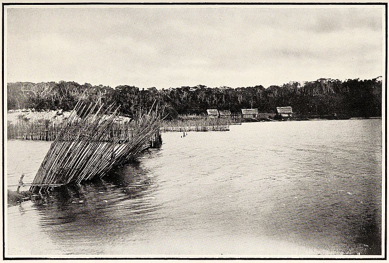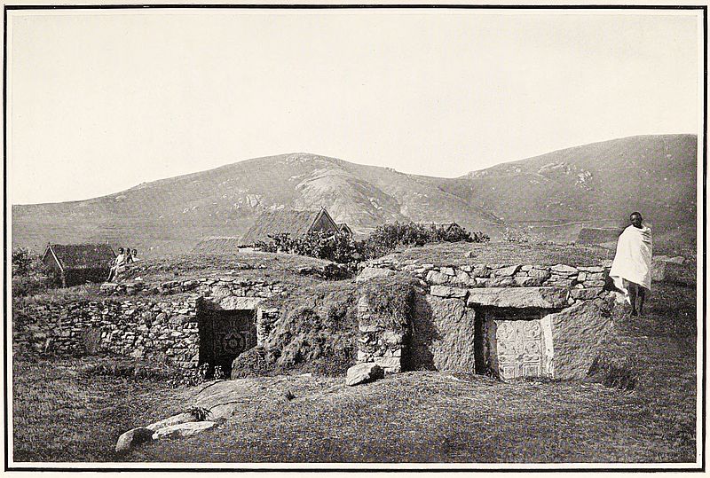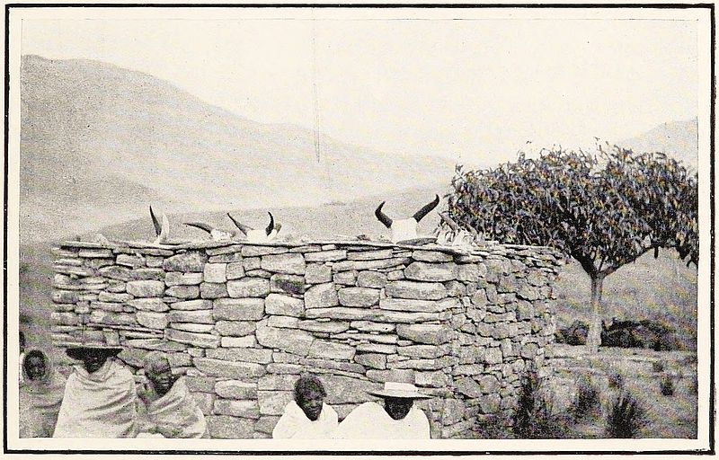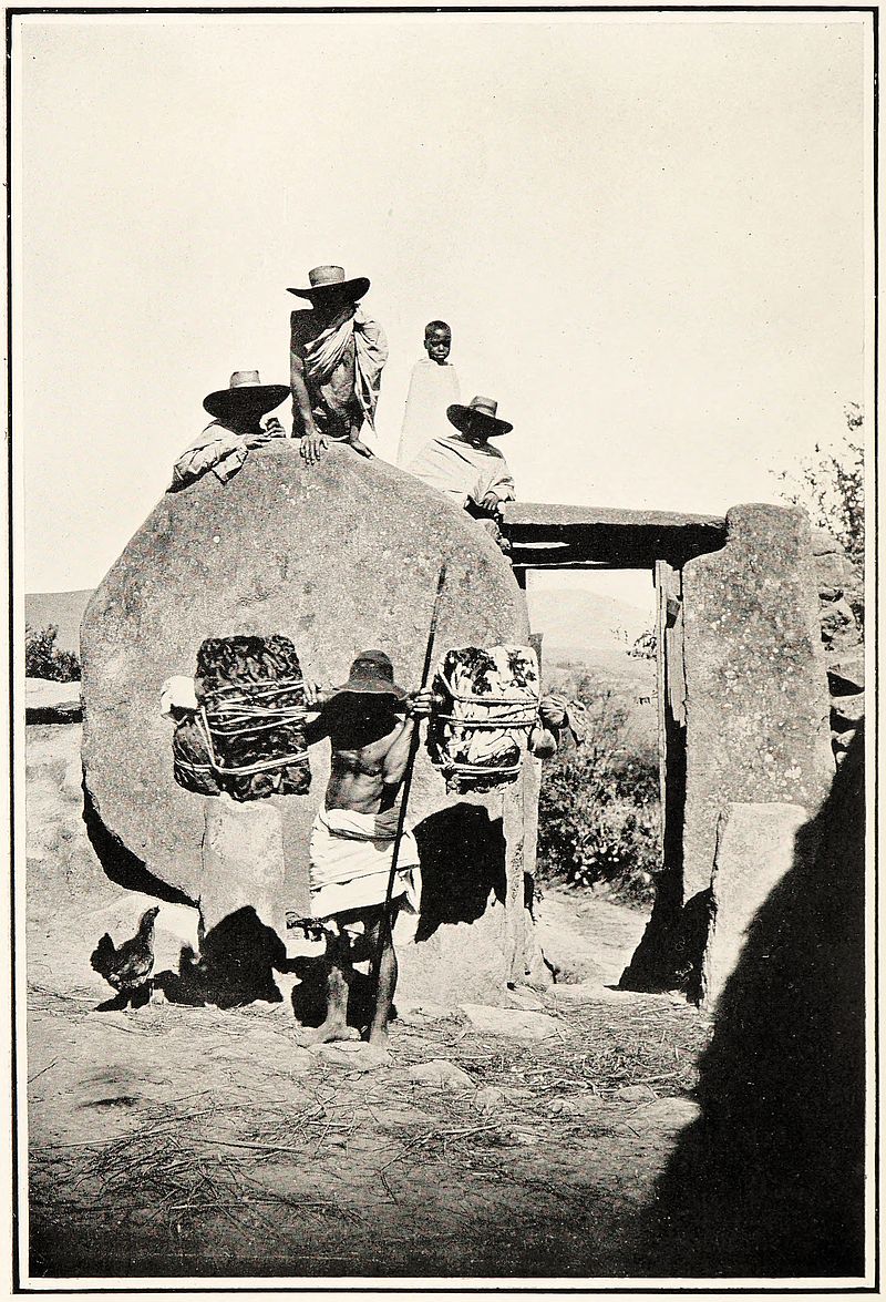 The stone is levered into position closing the opening. A deep fosse or ditch surrounding the village completes its fortification. The man in front is carrying two packages secured to a pole in the usual manner of the country