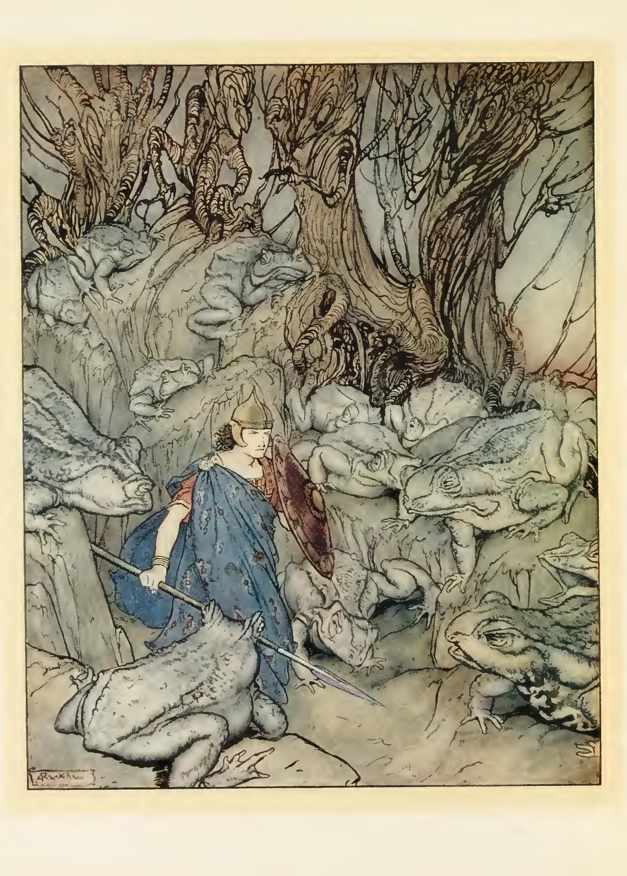 “If,” said one irritable guard, “if we buzzed a spear at the persistent stranger, or if one slung at him with a jagged pebble!”
