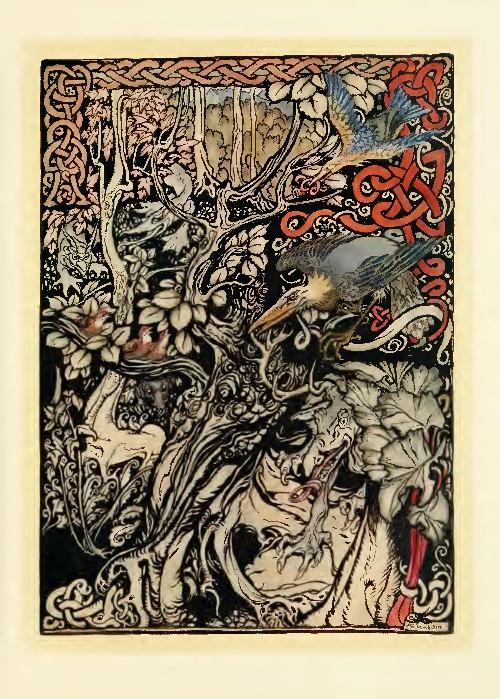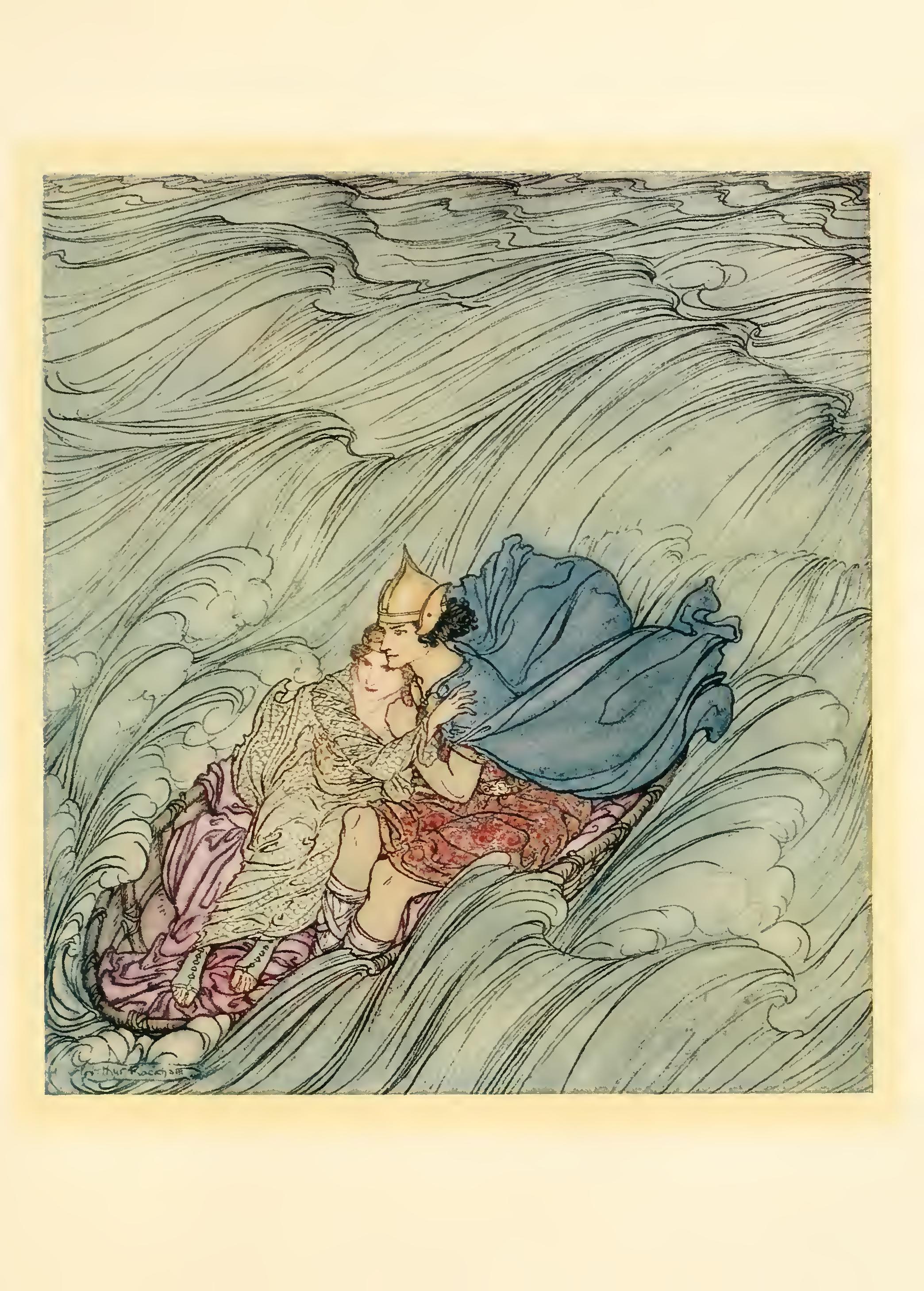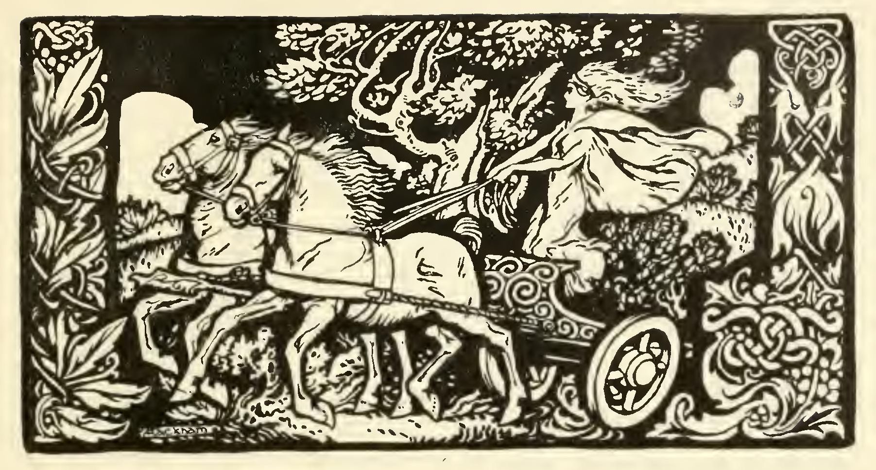 They came to Mongan’s palace at Moy Linney, and it was not until they reached the palace that they found they had been away one whole year, for they had thought they were only away one night. They lived then peacefully and lovingly together, and that ends the story, but Bro’tiarna did not know that Mongan was Fionn.