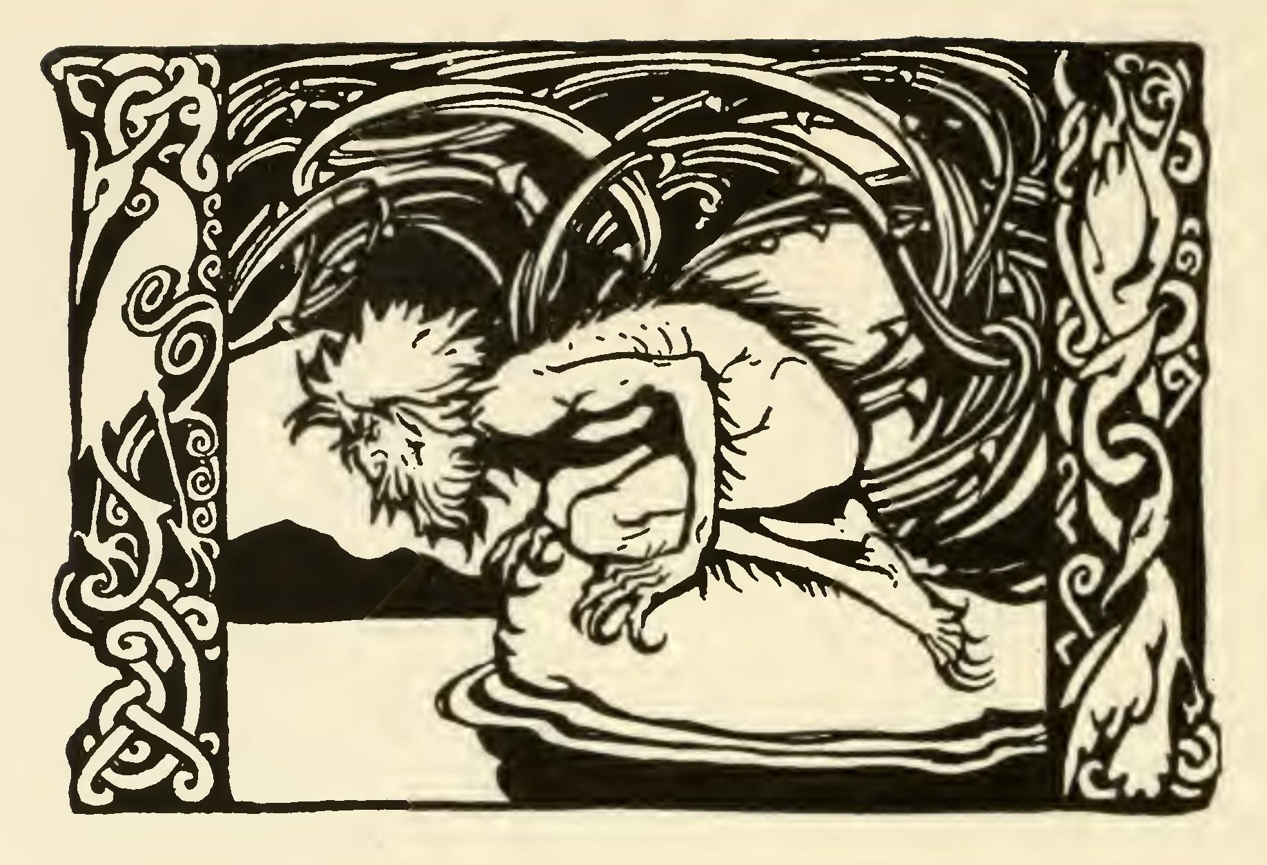 “I saw that I was hairy and tufty and bristled as a savage boar; that I was lean as a stripped bush; that I was greyer than a badger; withered and wrinkled like an empty sack; naked as a fish; wretched as a starving crow in winter; and on my fingers and toes there were great curving claws, so that I looked like nothing that was known, like nothing that was animal or divine. And I sat by the pool weeping my loneliness and wildness and my stern old age; and I could do no more than cry and lament between the earth and the sky, while the beasts that tracked me listened from behind the trees, or crouched among bushes to stare at me from their drowsy covert.