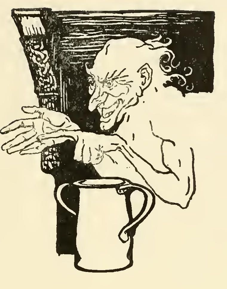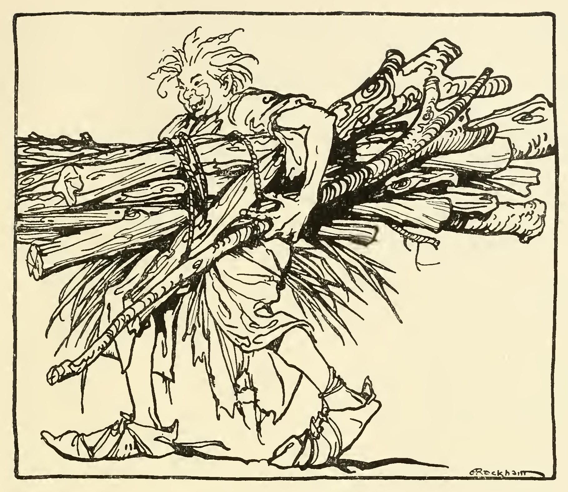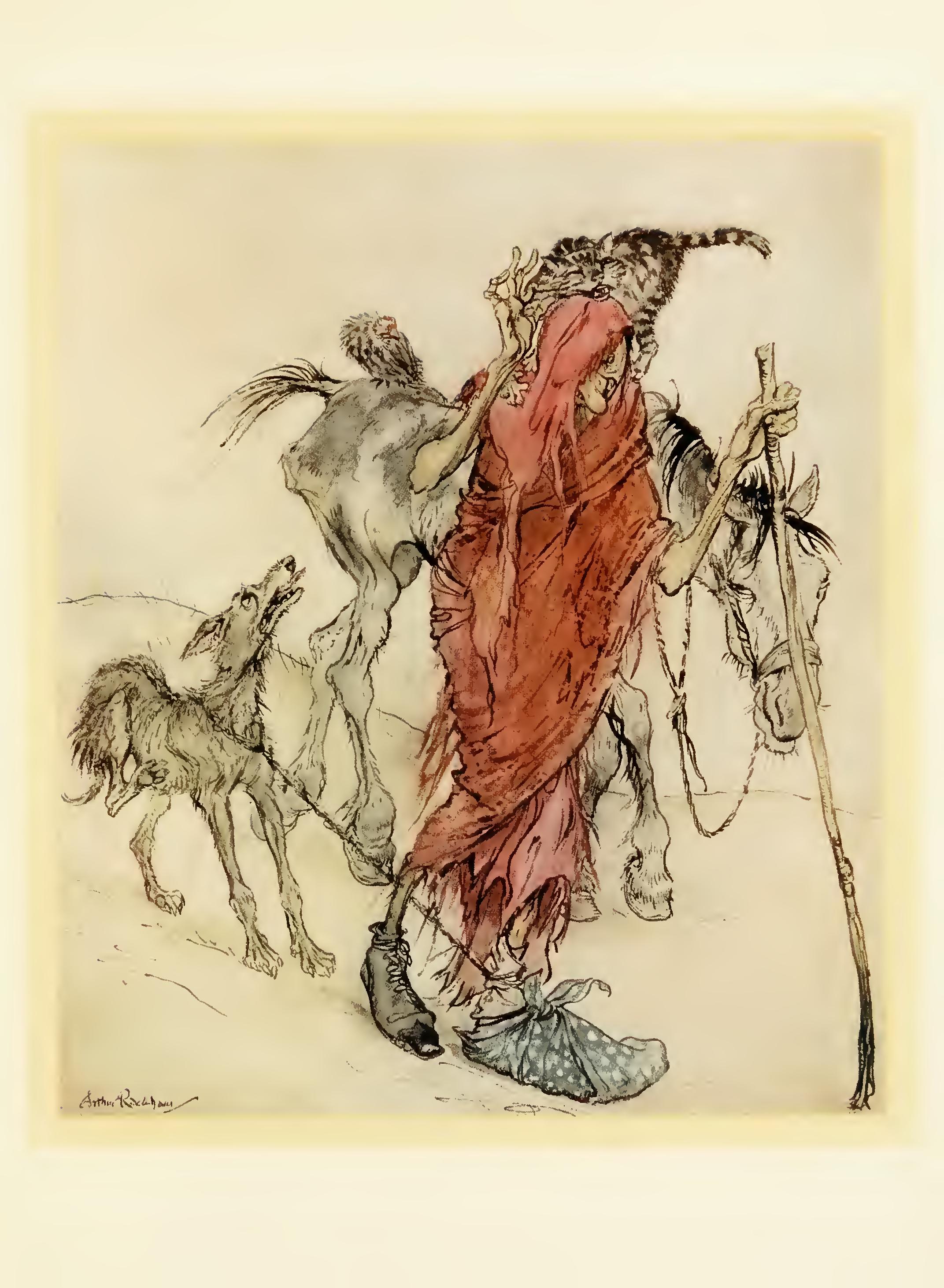 Now the Hag of the Mill was a bony, thin pole of a hag with odd feet. That is, she had one foot that was too big for her, so that when she lifted it up it pulled her over; and she had one foot that was too small for her, so that when she lifted it up she didn’t know what to do with it. She was so long that you thought you would never see the end of her, and she was so thin that you thought you didn’t see her at all. One of her eyes was set where her nose should be and there was an ear in its place, and her nose itself was hanging out of her chin, and she had whiskers round it. She was dressed in a red rag that was really a hole with a fringe on it, and she was singing “Oh, hush thee, my one love” to a cat that was yelping on her shoulder.