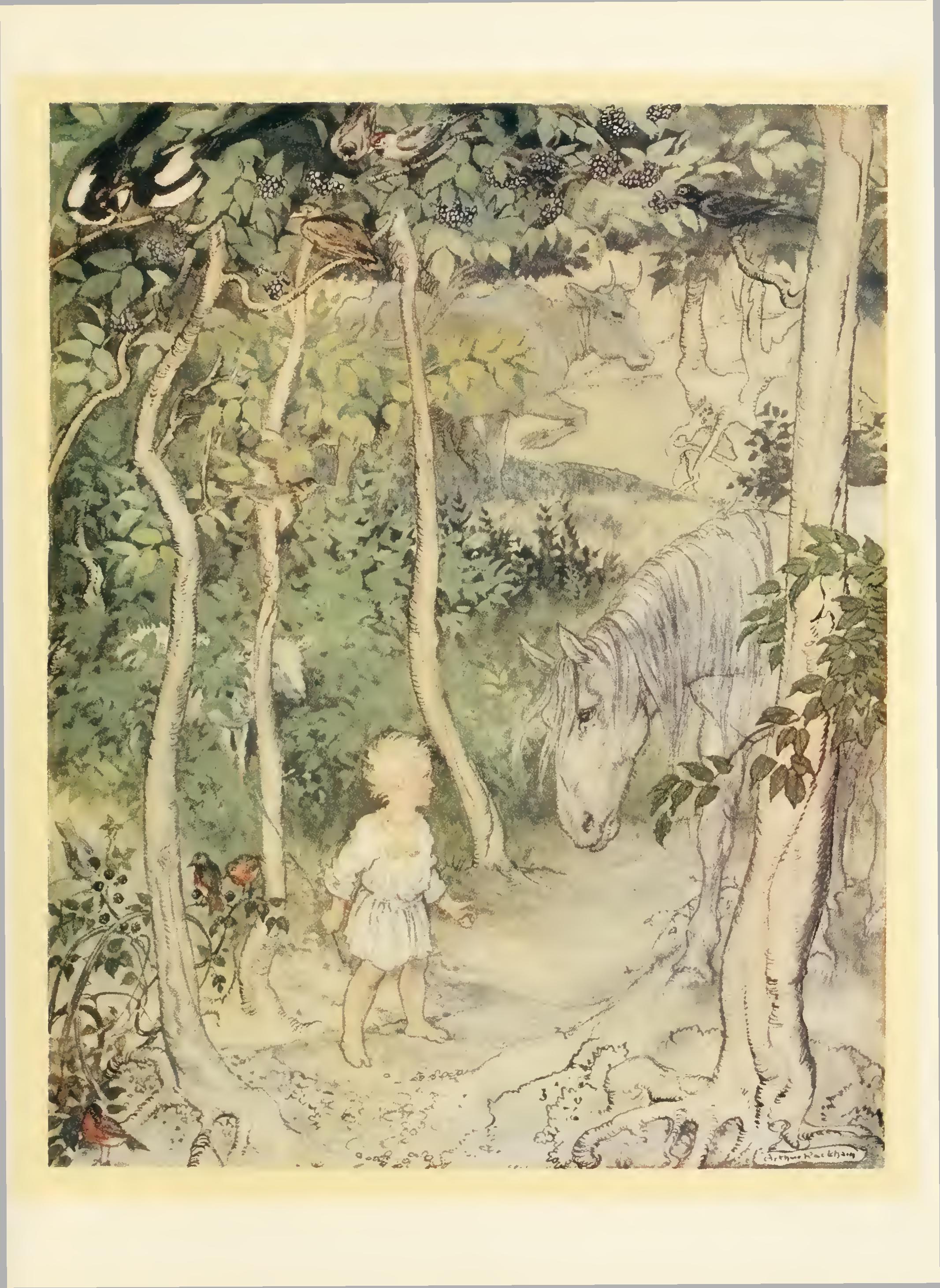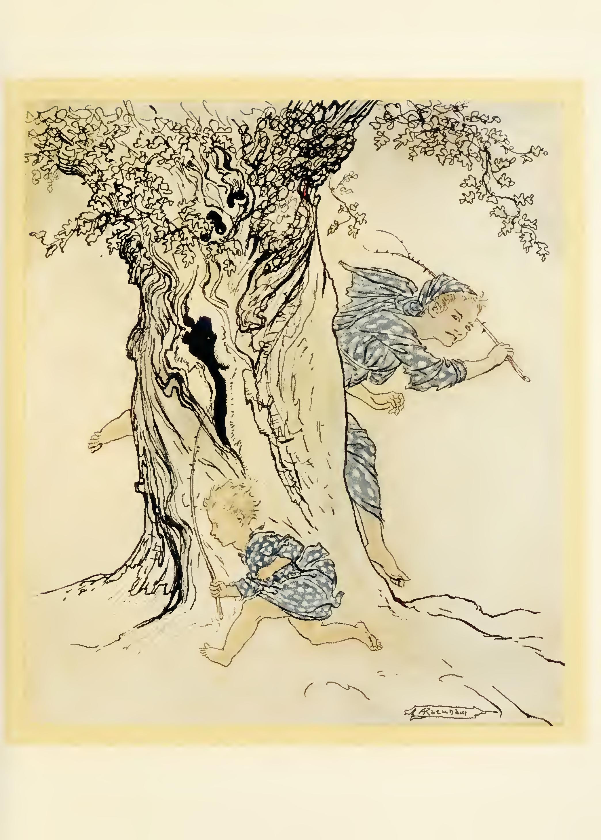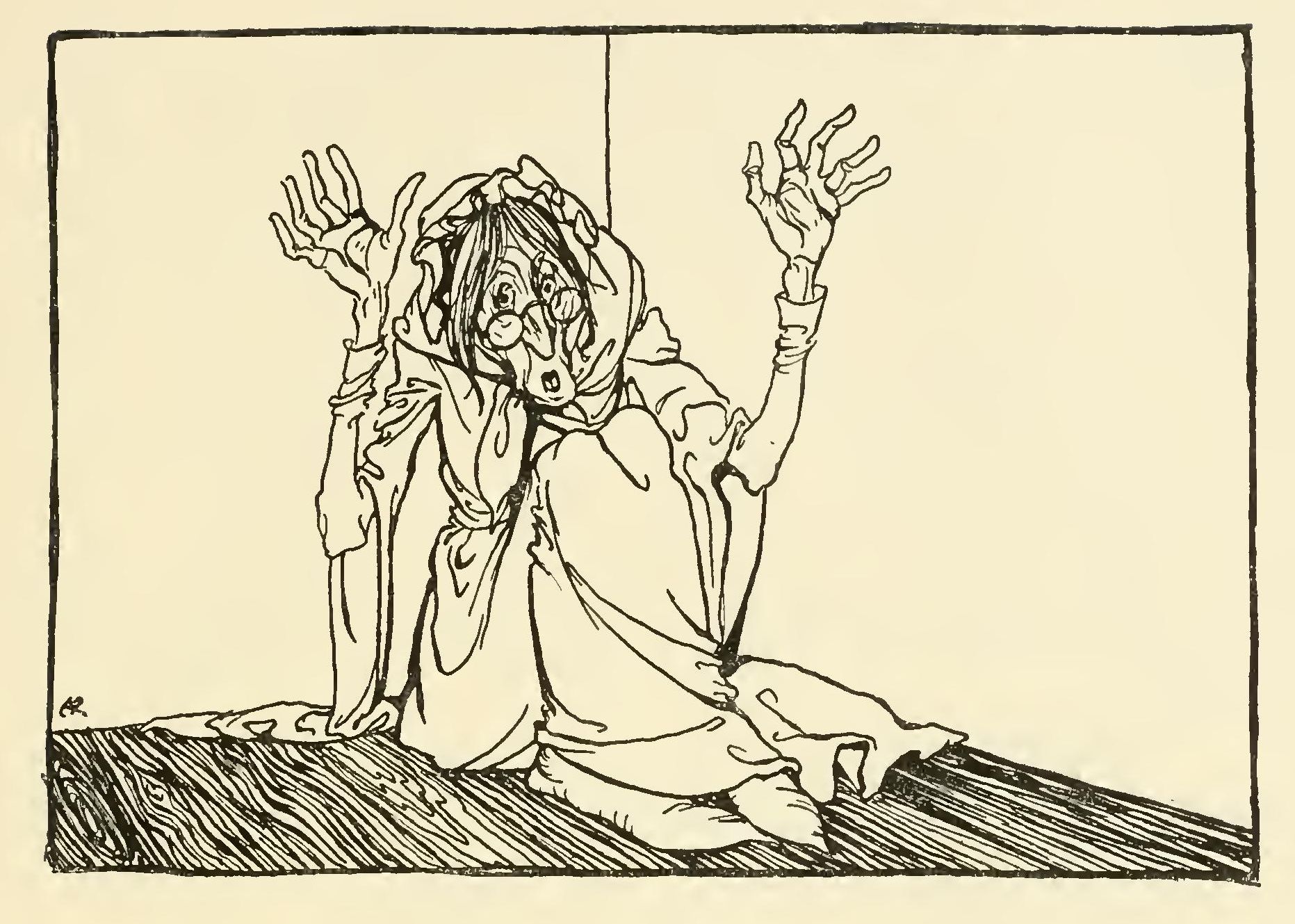 Now the Hag of the Mill was a bony, thin pole of a hag with odd feet. That is, she had one foot that was too big for her, so that when she lifted it up it pulled her over; and she had one foot that was too small for her, so that when she lifted it up she didn’t know what to do with it. She was so long that you thought you would never see the end of her, and she was so thin that you thought you didn’t see her at all. One of her eyes was set where her nose should be and there was an ear in its place, and her nose itself was hanging out of her chin, and she had whiskers round it. She was dressed in a red rag that was really a hole with a fringe on it, and she was singing “Oh, hush thee, my one love” to a cat that was yelping on her shoulder.