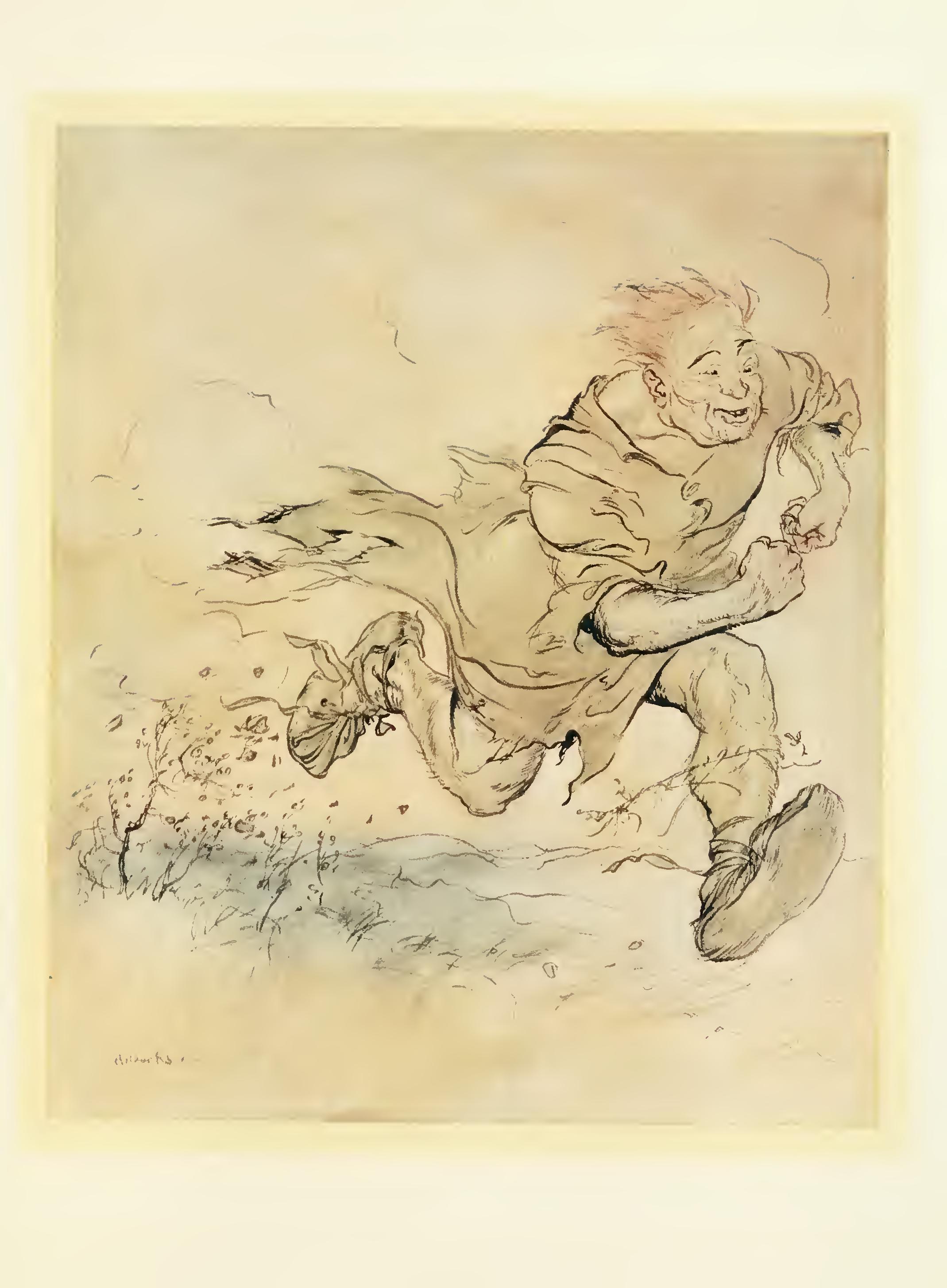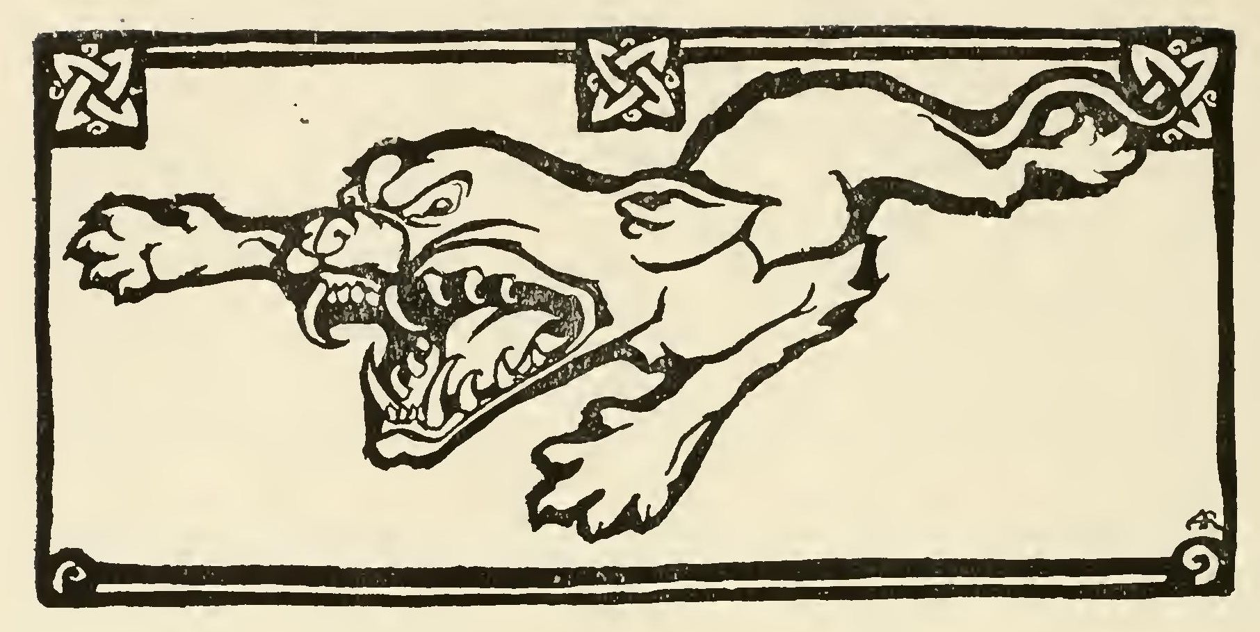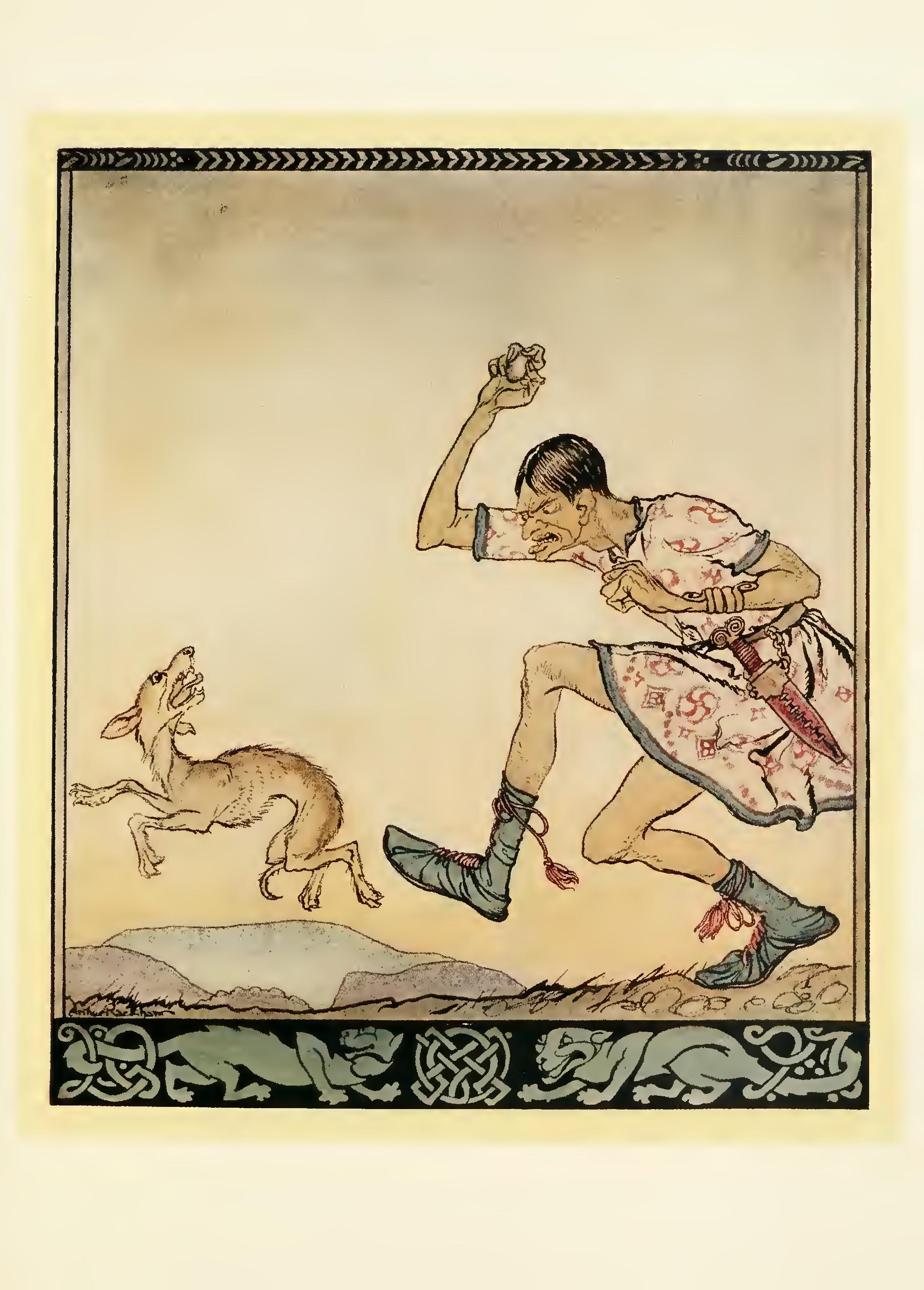 She had a tall skinny dog behind her called Brotar. It hadn’t a tooth in its head except one, and it had the toothache in that tooth. Every few steps it used to sit down on its hunkers and point its nose straight upwards, and make a long, sad complaint about its tooth; and after that it used to reach its hind leg round and try to scratch out its tooth; and then it used to be pulled on again by the straw rope that was round its neck, and which was tied at the other end to the hag’s heaviest foot.