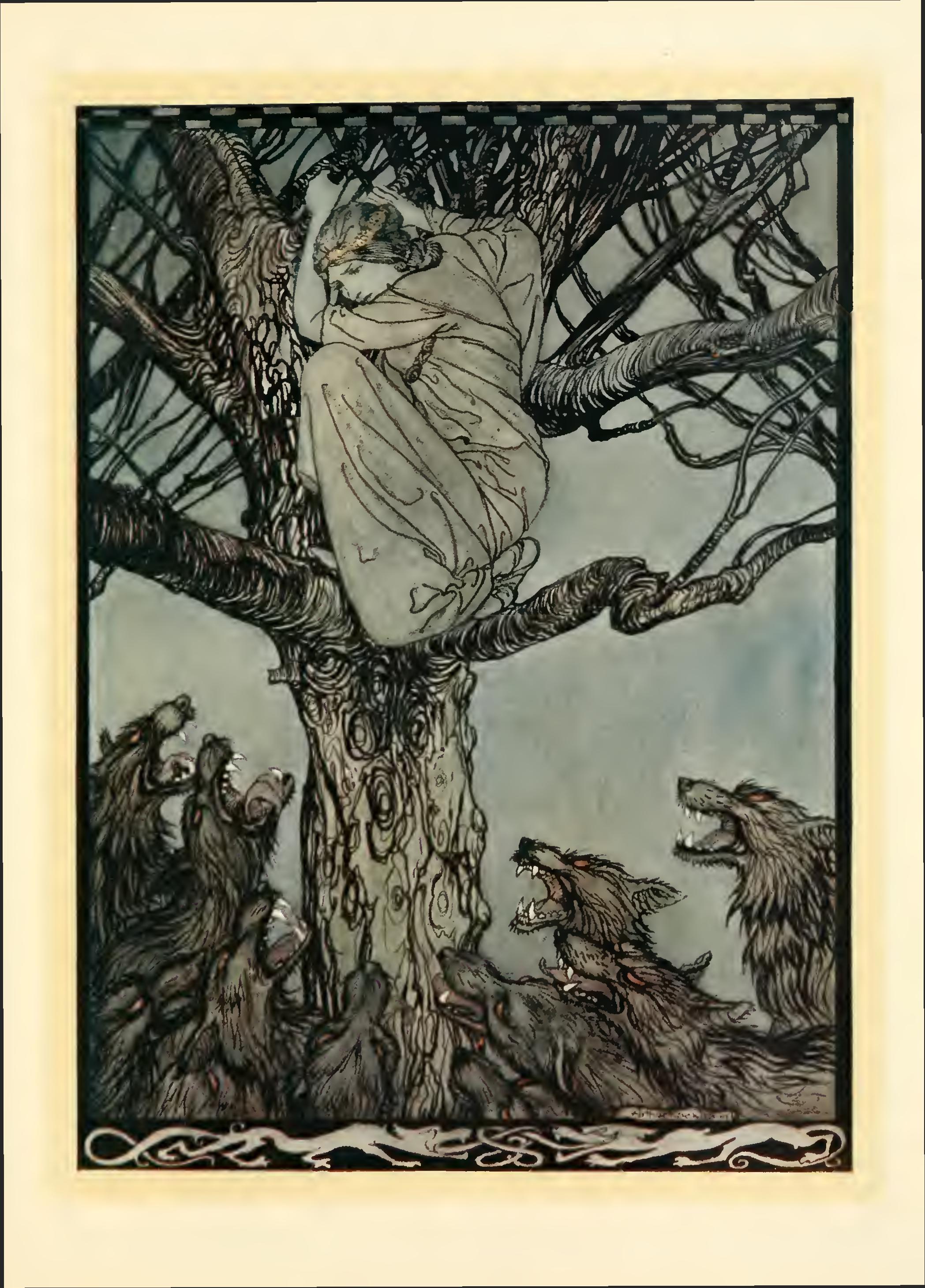 “The creatures of the forest scented me and knew I was alone. They stole with silken pad behind my back and snarled when I faced them; the long, grey wolves with hanging tongues and staring eyes chased me to my cleft rock; there was no creature so weak but it might hunt me, there was no creature so timid but it might outface me. And so I lived for two tens of years and two years, until I knew all that a beast surmises and had forgotten all that a man had known.