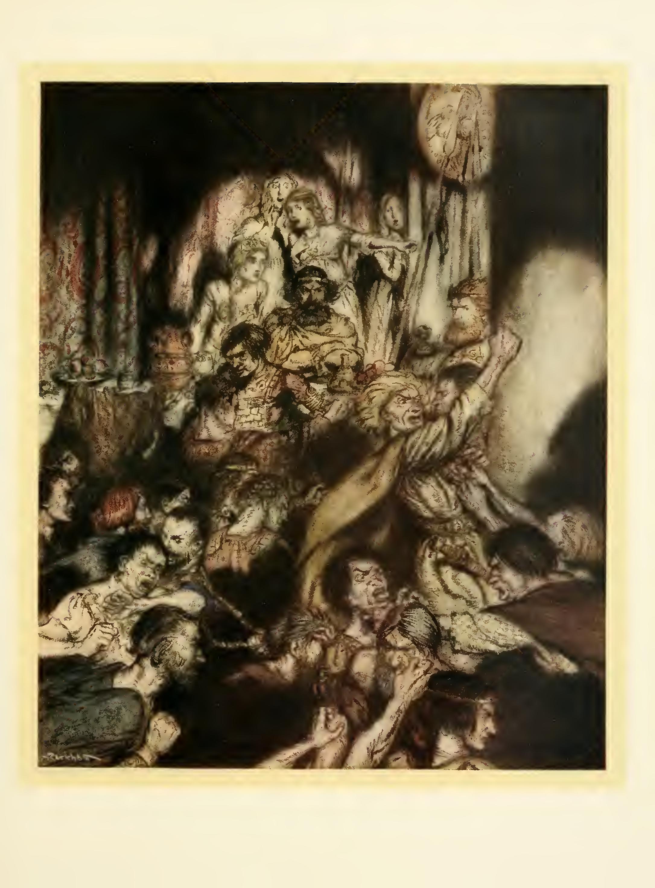 It was now drawing towards evening, and a feast was prepared for the guests with a banquet to follow it. At the feast Duv Laca sat beside the King of Leinster, but Mongan sat opposite him with Ivell, and Mongan put more and more magic into the hag, so that her cheeks shone and her eyes gleamed, and she was utterly bewitching to the eye; and when Branduv looked at her she seemed to grow more and more lovely and more and more desirable, and at last there was not a bone in his body as big as an inch that was not filled with love and longing for the girl.