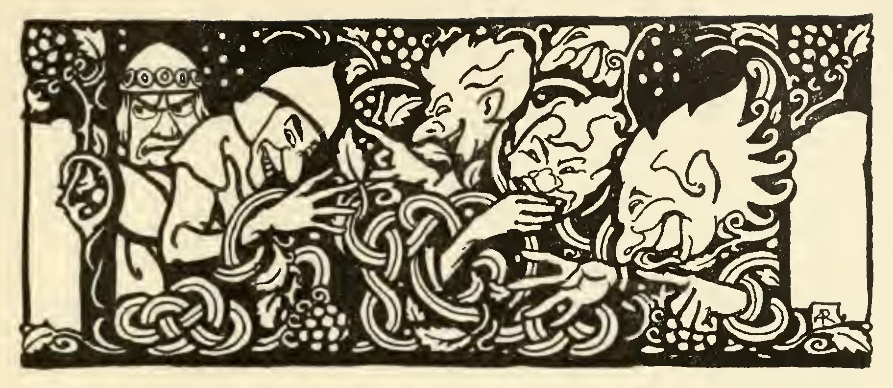 “The king would suspect something if I did not kiss you,” said he, and then he gave the hag over to the king. After that they all got drunk and merry, and soon there was a great snoring and snorting, and very soon all the servants fell asleep also, so that Mongan could not get anything to drink. Mac an Da’v said it was a great shame, and he kicked some of the servants, but they did not budge, and then he slipped out to the stables and saddled two mares. He got on one with his wife behind him and Mongan got on the other with Duv Laca behind him, and they rode away towards Ulster like the wind, singing this song: The King of Leinster was married to-day, Married to-day, married to-day, The King of Leinster was married to-day, And every one wishes him joy.