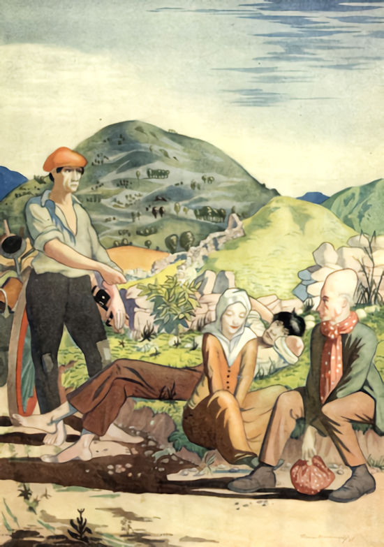 On being released the cow lay down again in the grass and resumed its interrupted cud. As the evening had grown chill the Thin Woman and the children huddled close to the warm animal. They drew pieces of cake from their wallets, and ate these and drank happily from the vessel of milk. Now and then the cow looked benignantly over its shoulder bidding them a welcome to its hospitable flanks. It had a mild, motherly eye, and it was very fond of children. The youngsters continually deserted their meal in order to put their arms about the cow’s neck to thank and praise her for her goodness, and to draw each other’s attention to various excellences in its appearance.