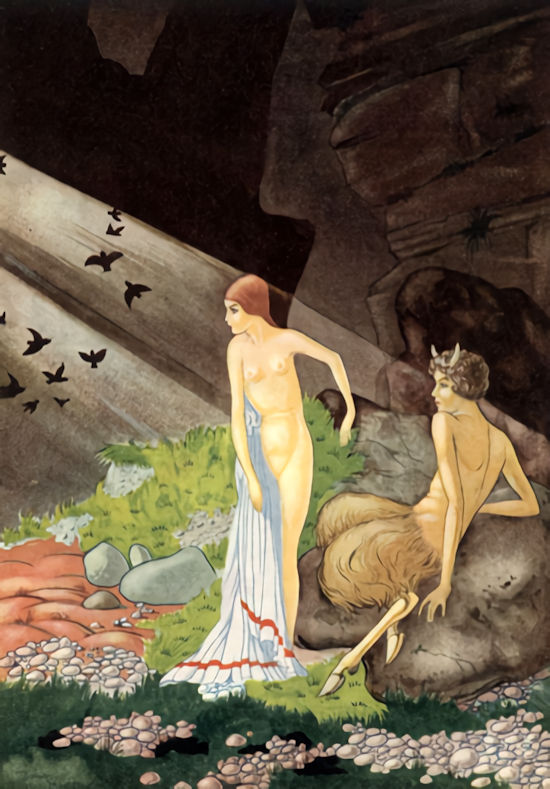 “There is none left to whom you may go but me only. Do not be afraid, but come to me and I will give you these wild delights which have been long forgotten. All things which are crude and riotous, all that is gross and without limit is mine. You shall not think and suffer any longer; but you shall feel so surely that the heat of the sun will be happiness: the taste of food, the wind that blows upon you, the ripe ease of your body—these things will amaze you who have forgotten them. My great arms about you will make you furious and young again; you shall leap on the hillside like a young goat and sing for joy as the birds sing. Leave this crabbed humanity that is barred and chained away from joy and come with me, to whose ancient quietude at the last both Strength and Beauty will come like children tired in the evening, returning to the freedom of the brutes and the birds, with bodies sufficient for their pleasure and with no care for Thought or foolish curiosity.”